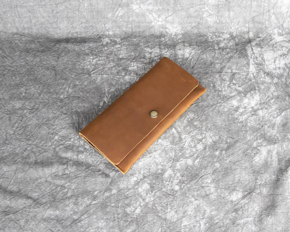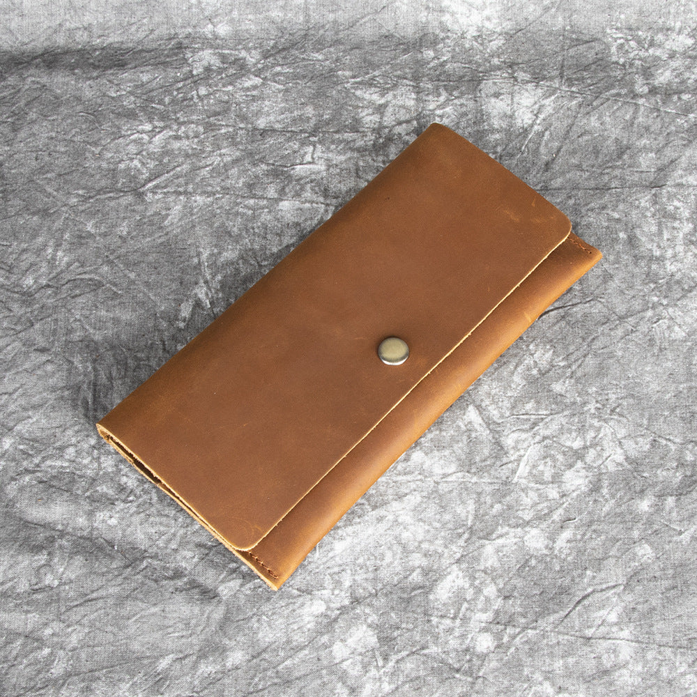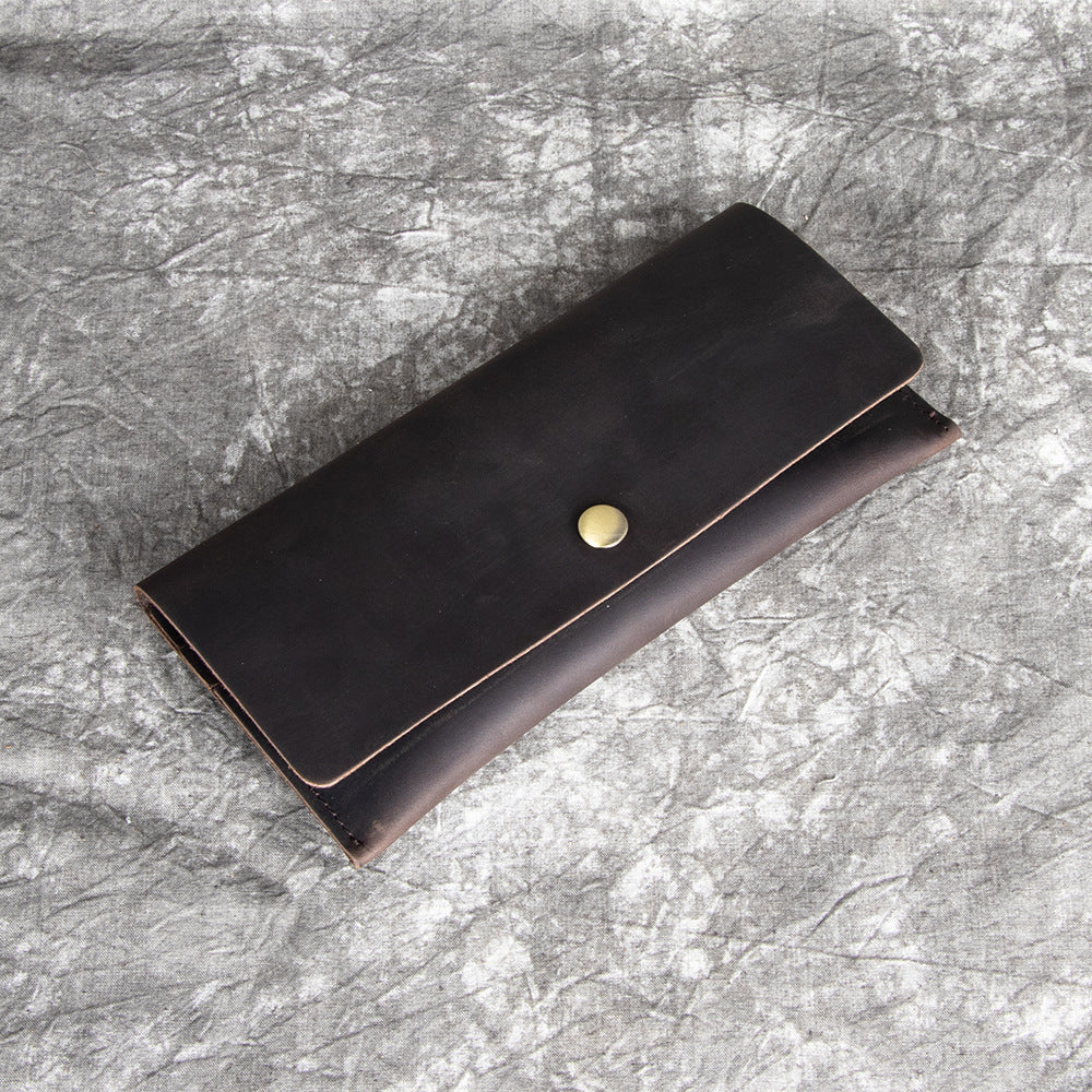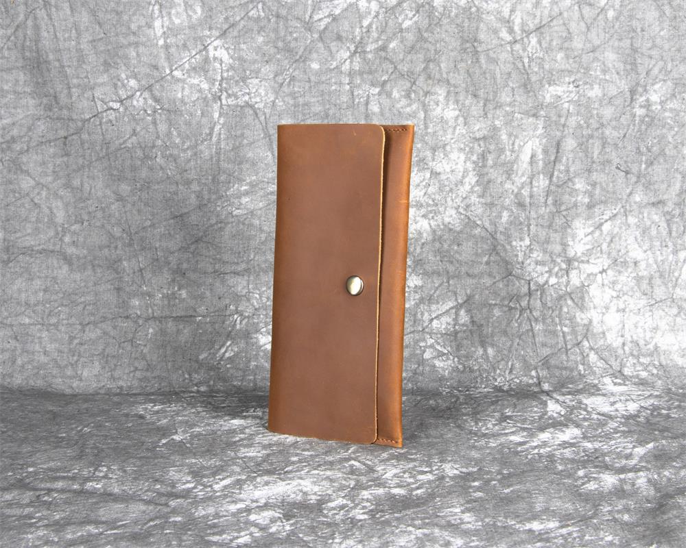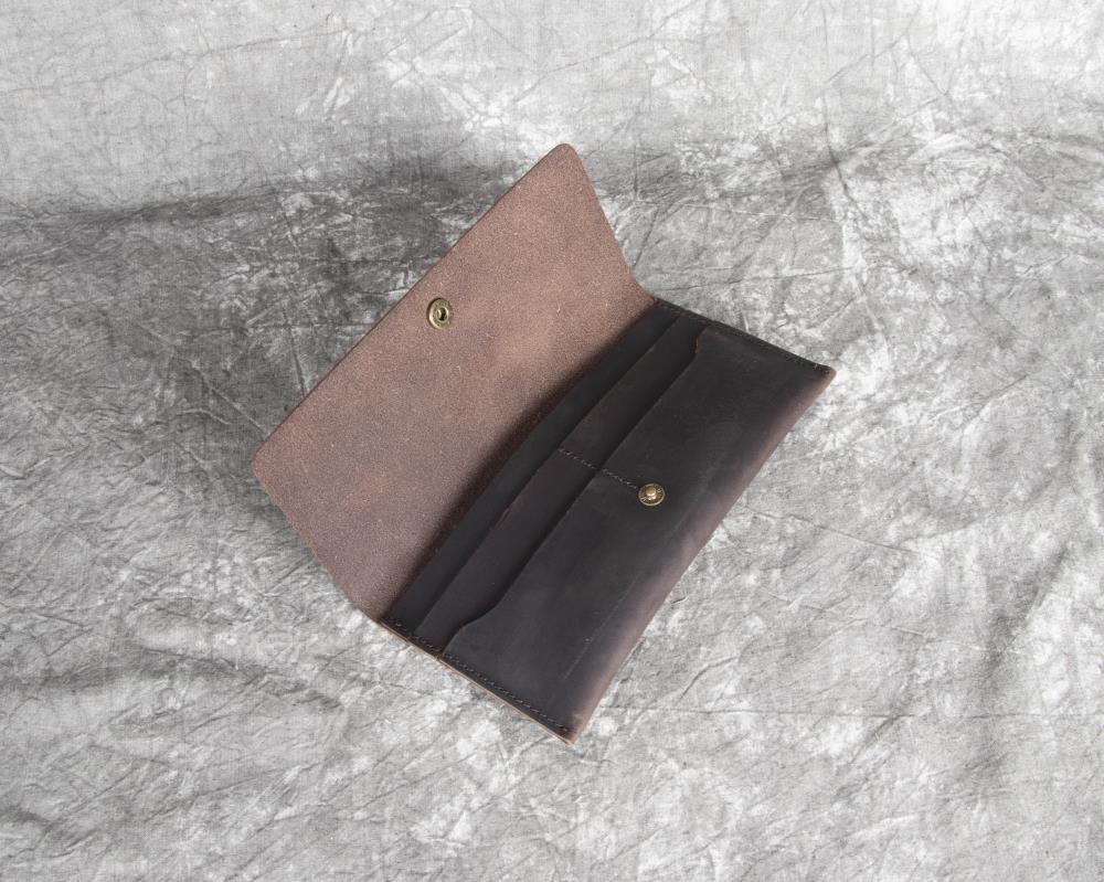 Discover the perfect blend of minimalist design and timeless elegance with our leather flap wallet. Expertly crafted from genuine full-grain crazy horse leather, this sleek wallet measures 19.5cm x 9.5cm x 0.5cm and weighs just 0.1kg, offering exceptional durability and style in a compact form.