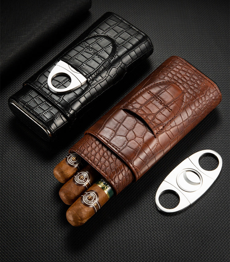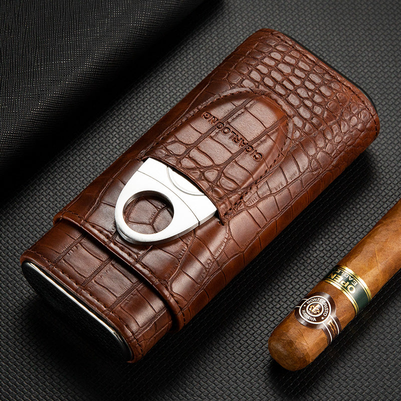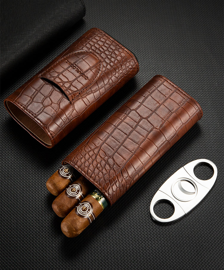 Design: Cool Brown Leather Mens 3pcs Cigar Case With Humidor Cutter Crocodile Pattern Leather Cigar Case for Men