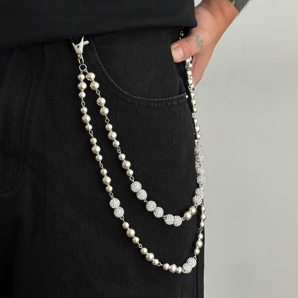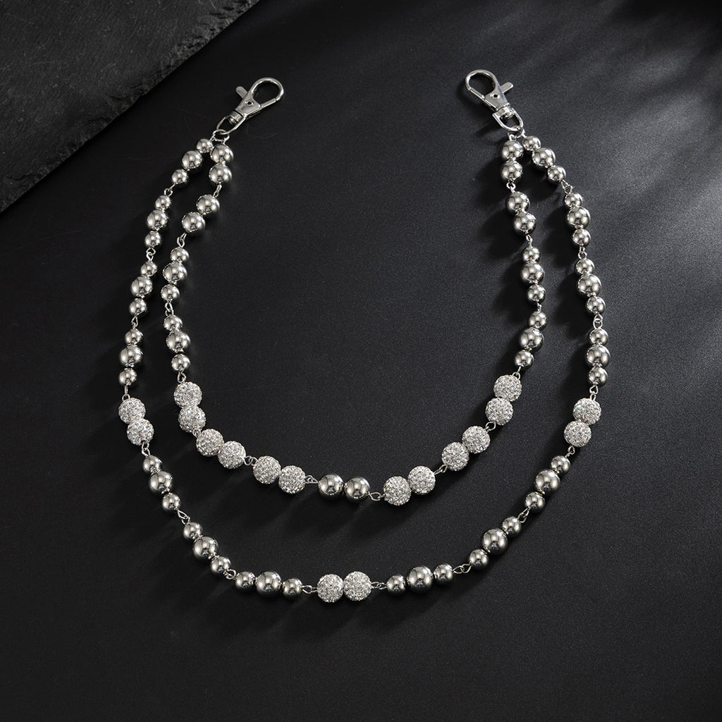 Introduce a refined yet bold statement to your accessory collection with the Beaded Wallet Chain, a dual-layer design that masterfully combines structural simplicity with eye-catching detail. This unique Ball Wallet Chain features a 56cm long strand and a 47cm short strand, both composed of alternating alloy beads and faceted cubic zirconia stones linked together to create a sleek, sparkling look. From afar, the chain presents a clean, metallic line, but a closer inspection reveals the intricate contrast between the smooth alloy beads and the brilliant, multi-faceted CZ stones. This versatile Double Pants Chain is designed for those who appreciate minimalist aesthetics infused with just the right amount of glamour and edge.