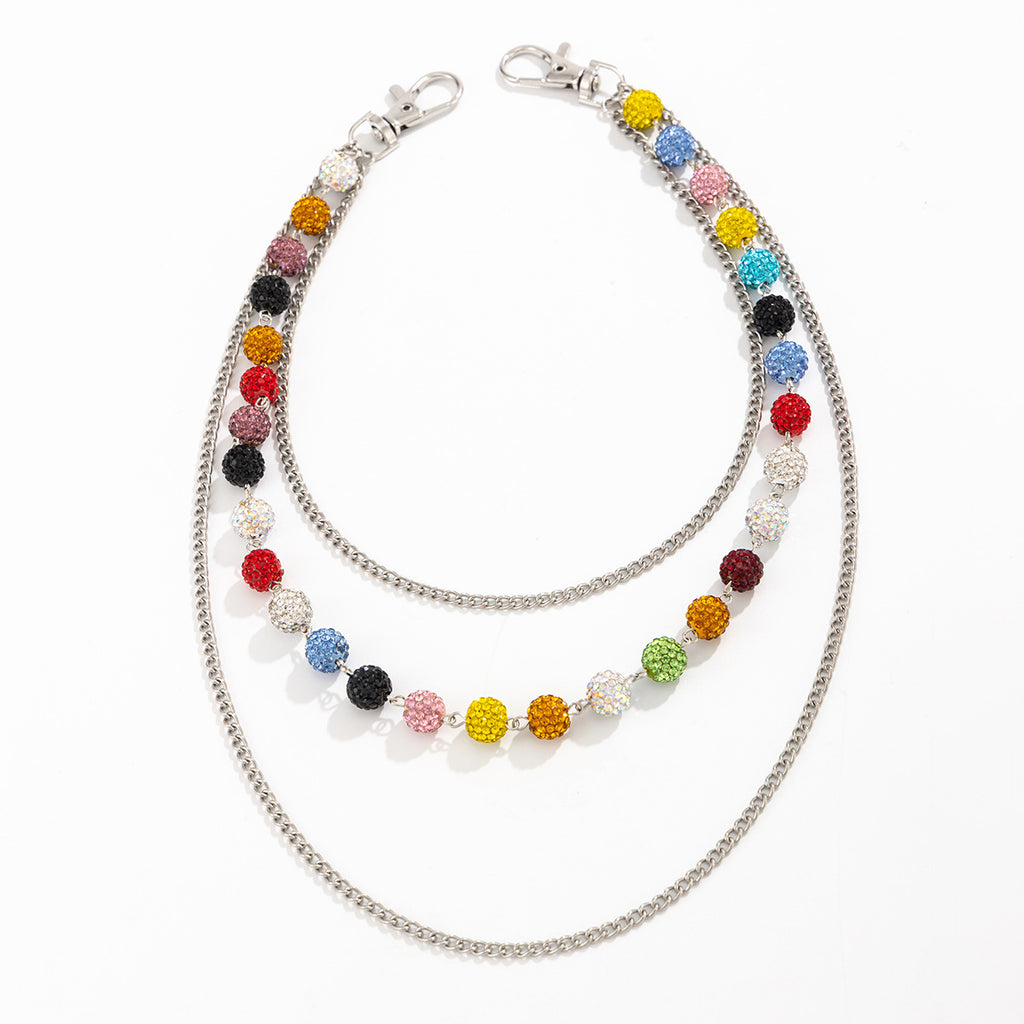 Introduce a vibrant and dimensional statement to your accessory collection with the Beaded Wallet Chain, a triple-layer design that artfully blends minimalist structure with dazzling, colorful detail. This unique Ball Wallet Chain features three distinct strands: a 62cm long alloy chain, a 42cm short alloy chain, and a central 51cm strand composed of multi-colored cubic zirconia beads, each faceted to catch and reflect light in a spectrum of hues. From a distance, the chains present a sleek, layered silhouette, but a closer look reveals the brilliant array of CZ colors and the delicate interplay of textures. This versatile Triple Pants Chain is designed for those who appreciate bold, artistic expression and versatile styling, making it a standout piece for fashion-forward individuals.
