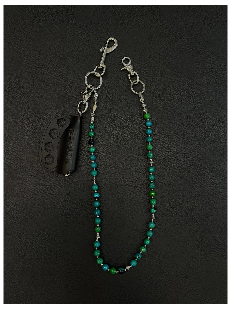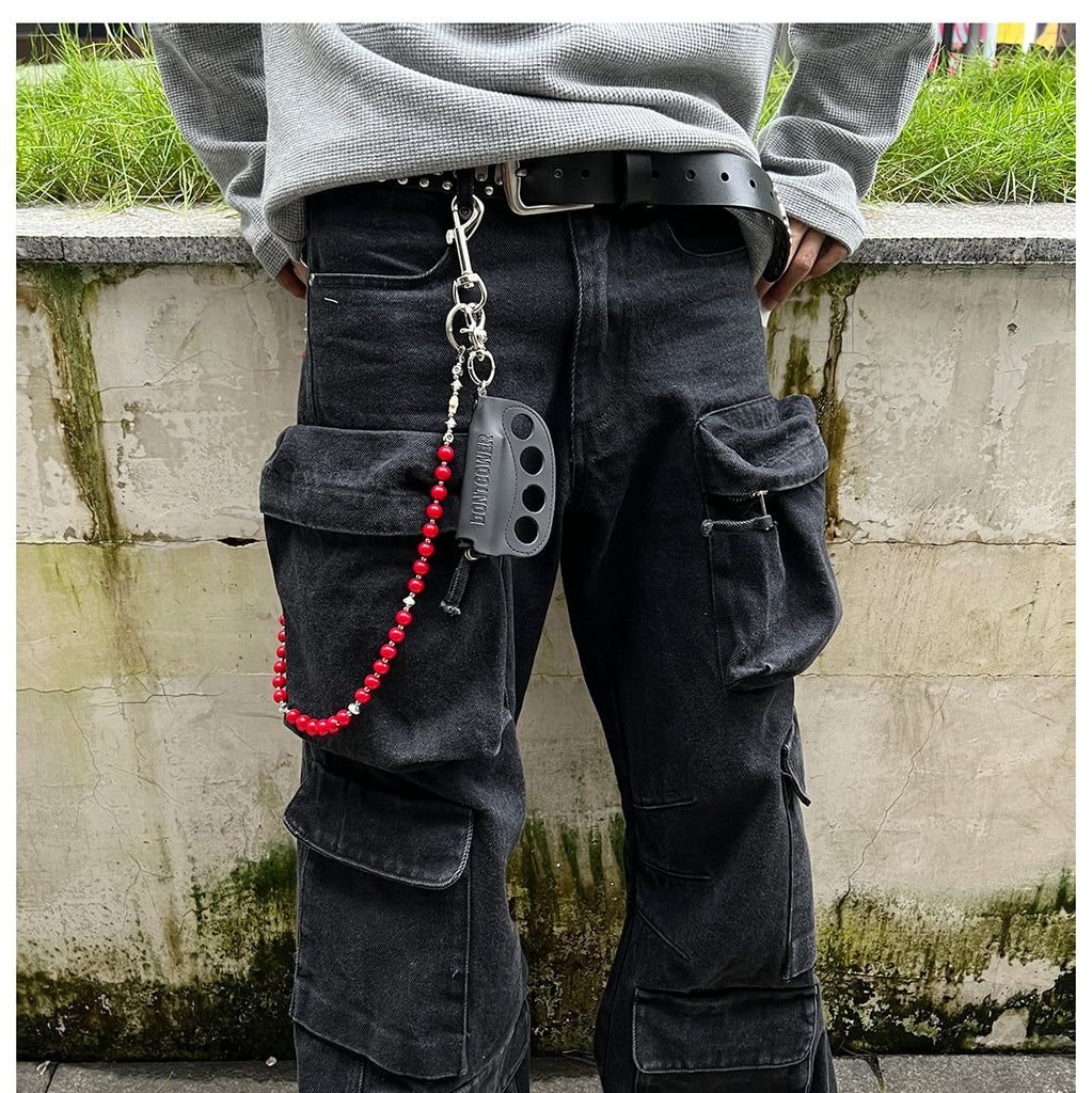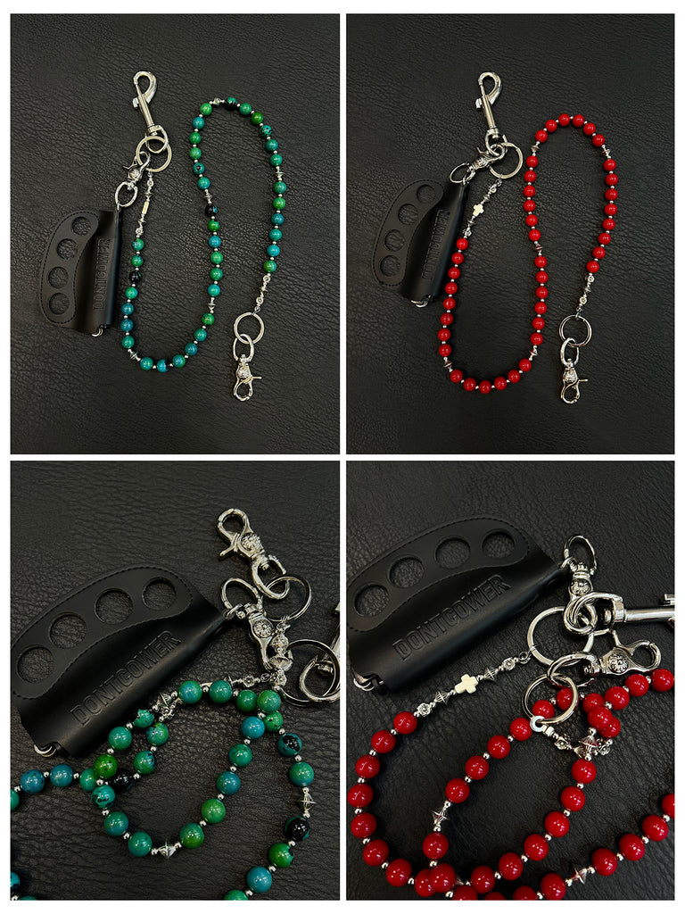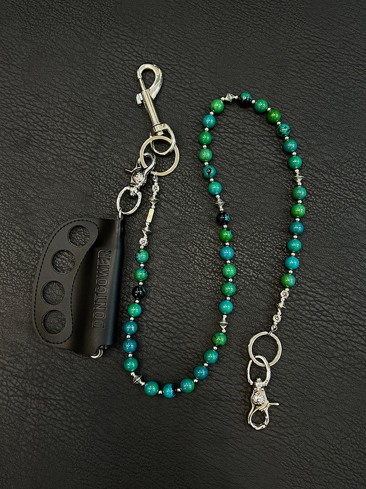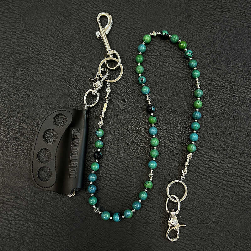 Elevate your accessory game with our extraordinary Ball Wallet Chain, a masterpiece that artfully blends natural beauty with urban edge. This 78cm chain showcases a stunning design of genuine agate stones in rich red and deep green hues, meticulously alternated with polished alloy beads. The dramatic focal point is a leather-crafted brass knuckles pendant, making this beaded Wallet Chain an undeniable statement piece for those who dare to stand out.