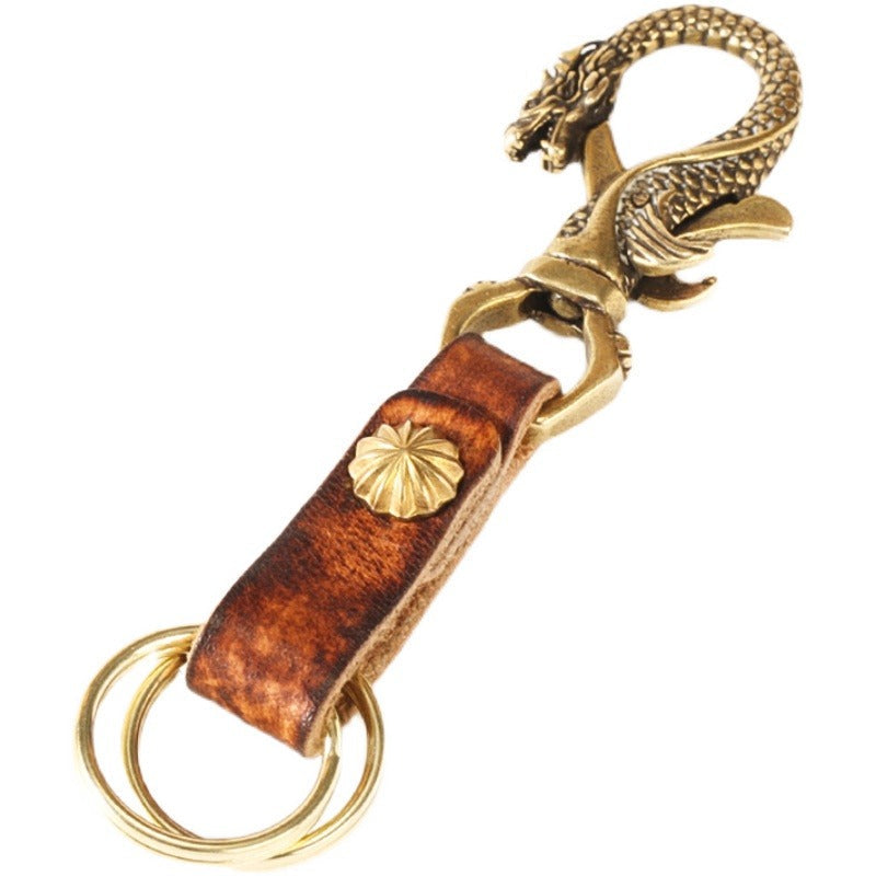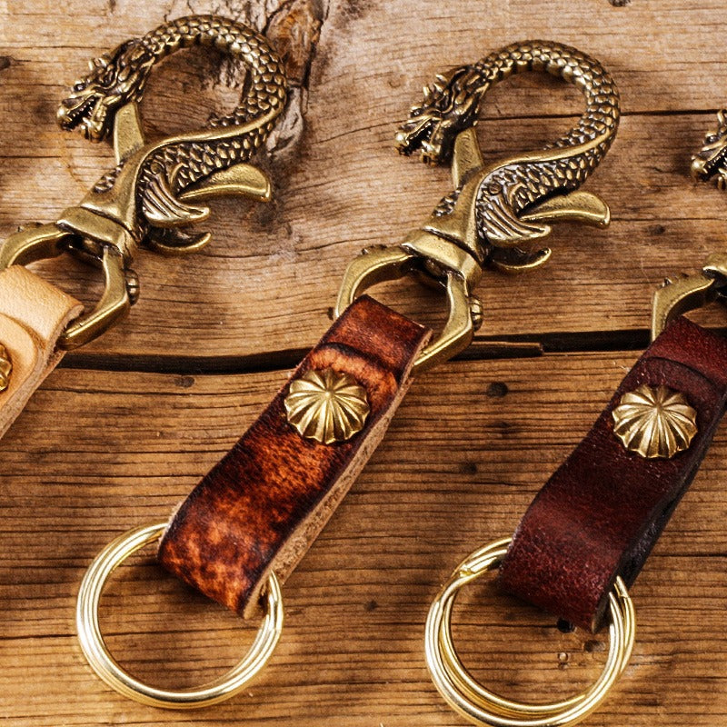 Style: Handmade Chinese Dragon Leather Brass Keyring Moto KeyChain Leather Keyring Moto Cross Key Holders Key Chain for Men