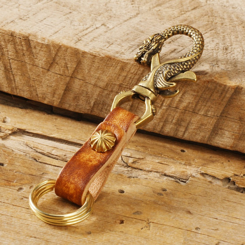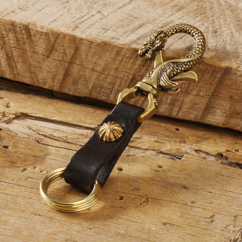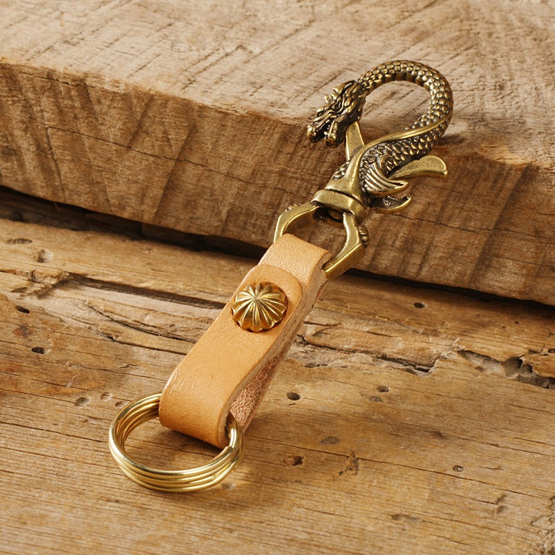 Design: Handmade Chinese Dragon Leather Brass Keyring Moto KeyChain Leather Keyring Moto Cross Key Holders Key Chain for Men