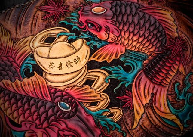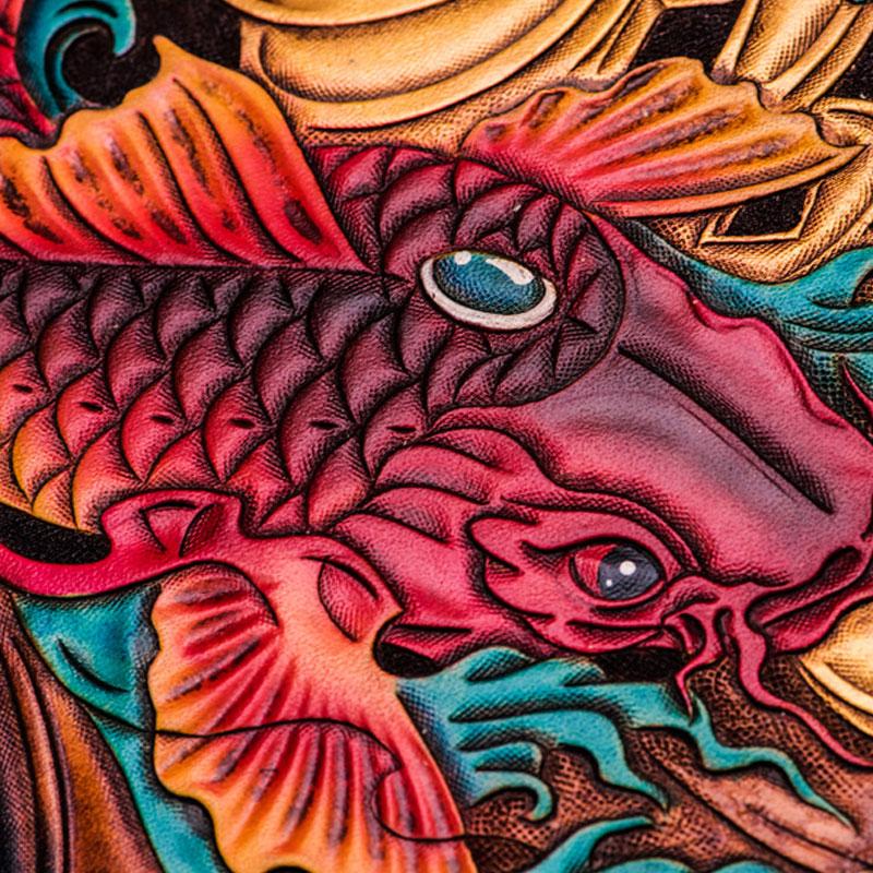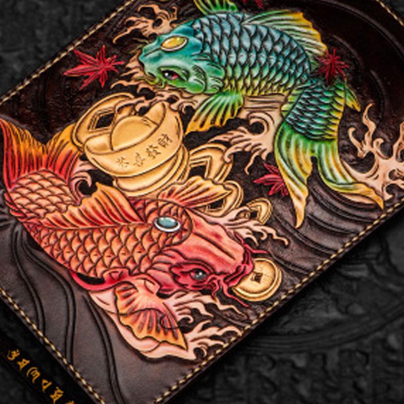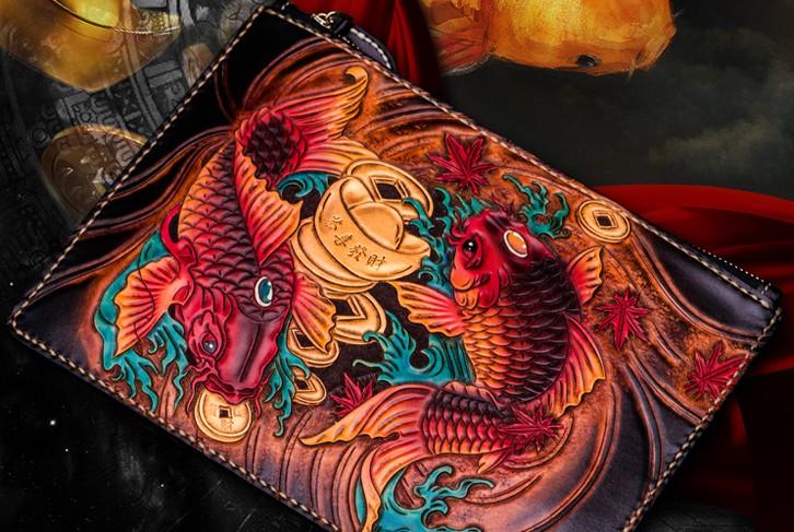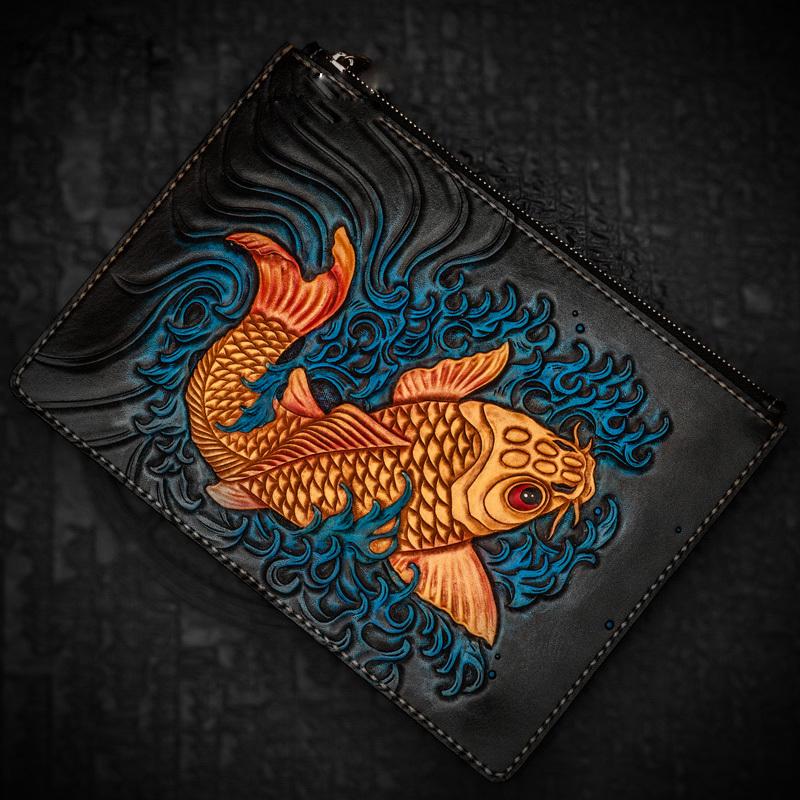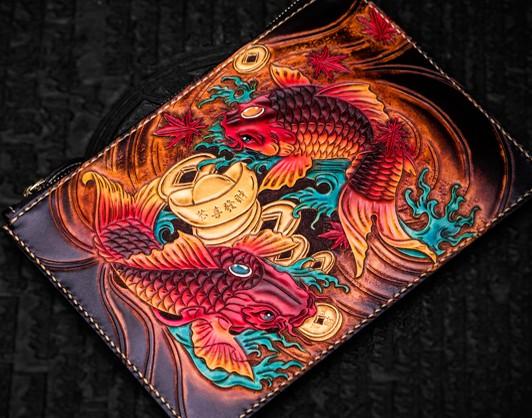 Style: Handmade Leather Carp Tooled Wristlet Bag iPad Bag Mens Cool Leather Wallet Long Clutch for Men