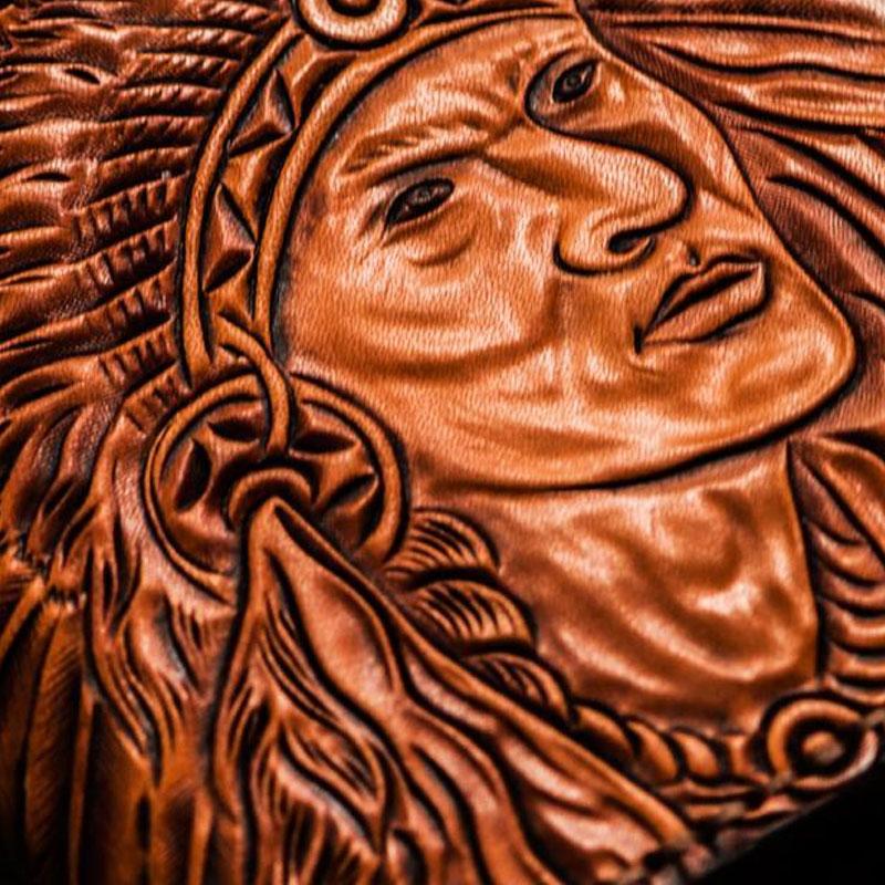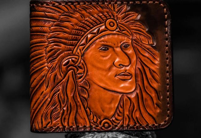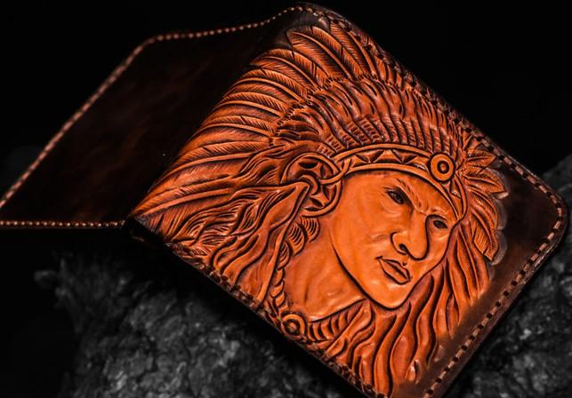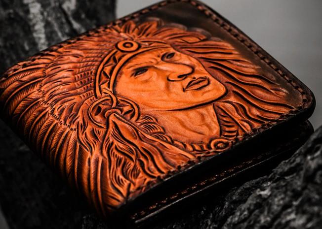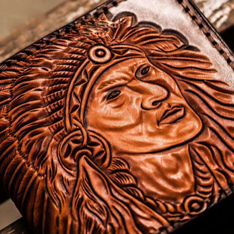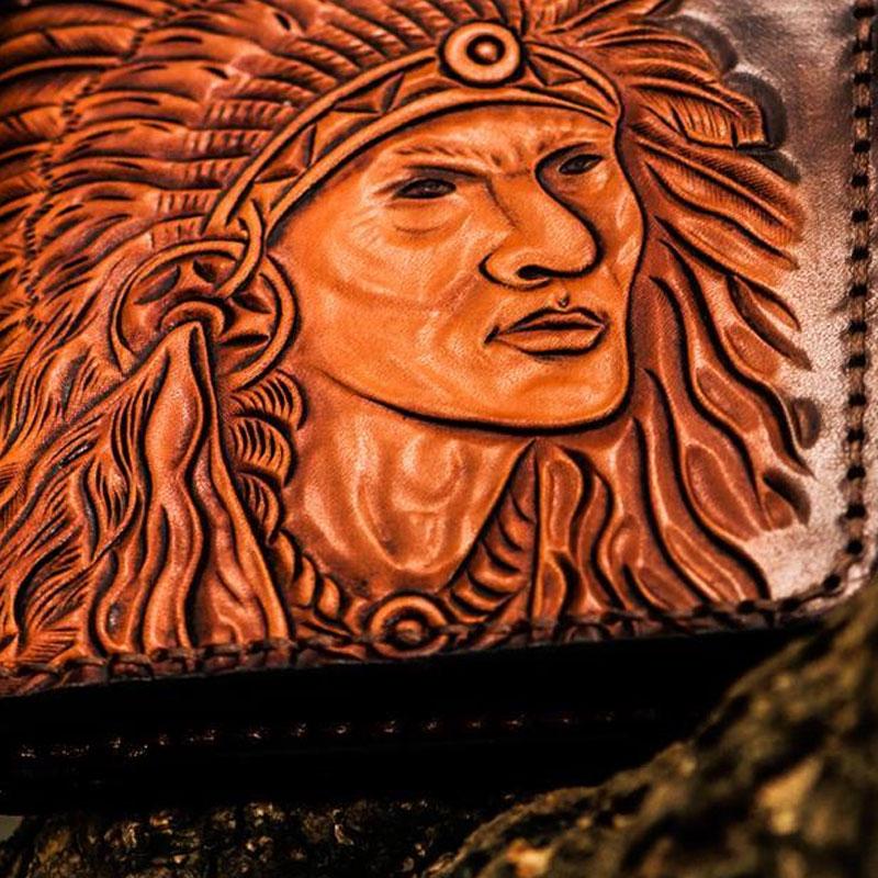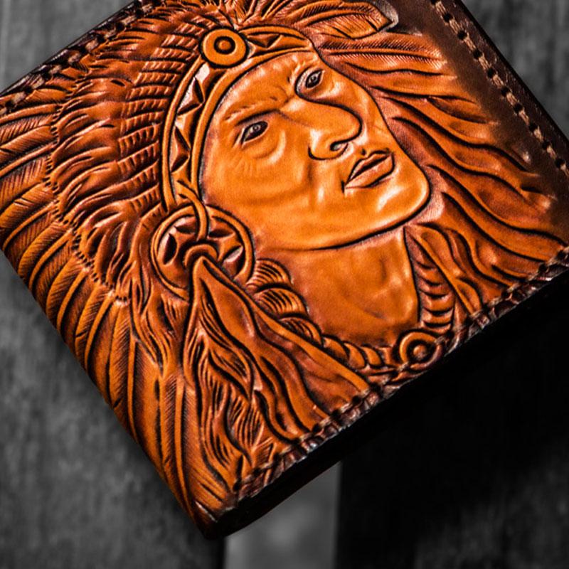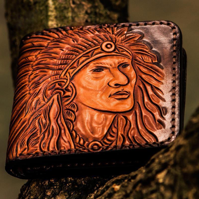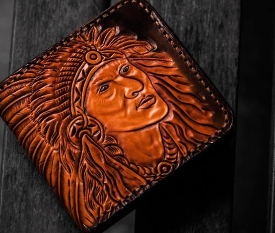 Handmade Leather Indian Chief Tooled Mens billfold Wallet Cool Leather Wallet Small Wallet for Men