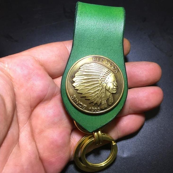 Style: Moto Leather Brass Keyring Biker KeyChain Green Indian Leather Keyring Moto Key Holders Key Chain Key Ring for Men