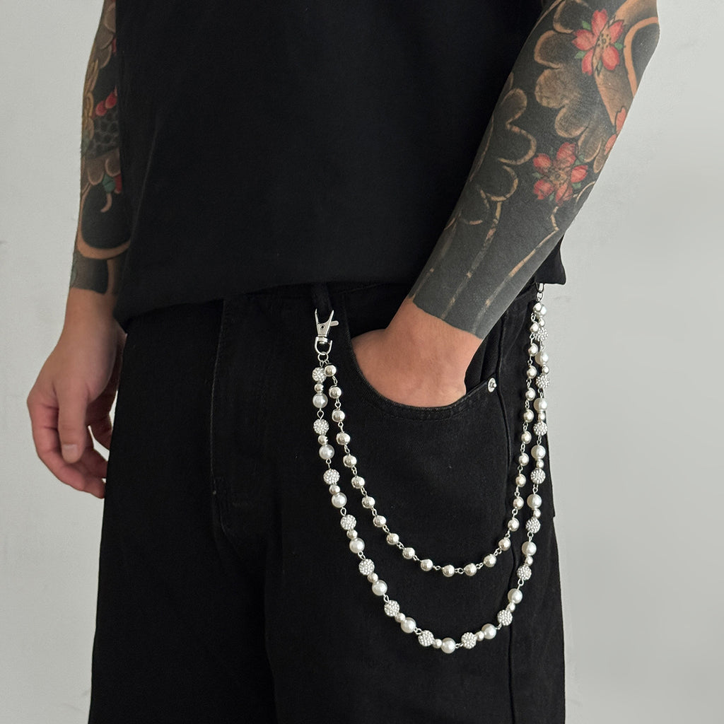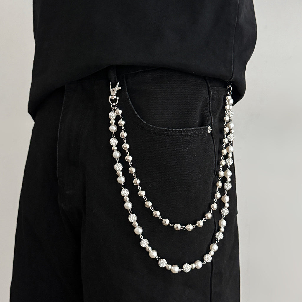 Introduce a bold and glamorous accent to your look with the Beaded Wallet Chain, a dual-layer design that masterfully blends organic elegance with striking sparkle. This unique Ball Wallet Chain features a 56cm long chain composed of alternating faux pearls and faceted cubic zirconia beads, linked to create a dazzling, multi-textured statement. The complementary shorter chain is crafted entirely from classic faux pearls, adding soft contrast and depth. This versatile Pearl Pants Chain is designed for those who appreciate subtlety and shine, offering a look that transitions effortlessly from subculture grit to refined sophistication.