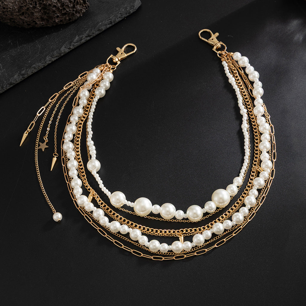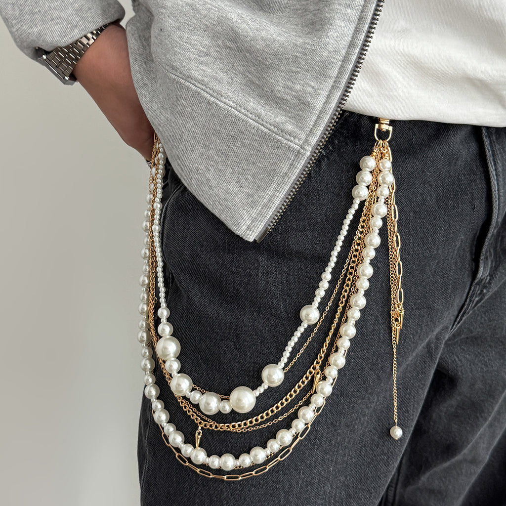 Introduce a masterful blend of texture, movement, and artistry with the Layered Wallet Chain, a complex and captivating accessory designed for the fashion-forward individual. This unique Pearl Wallet Chain features a sophisticated composition of seven distinct strands: two strands of lustrous faux pearls, five varied alloy chains, and three decorative tassel accents near the pant loop. Available in two classic finishes—Gold and Silver—this meticulously crafted Beaded Wallet Chain creates a voluminous, multi-dimensional statement that is as intricate as it is stylish. From afar, it presents a rich, layered silhouette, but a closer look reveals the interplay of pearls, metals, and tassels—a true testament to detailed craftsmanship and bold design.