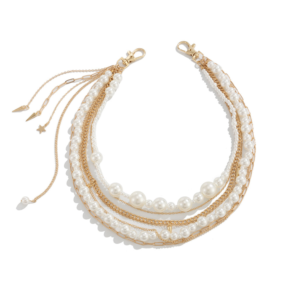 • Composition: 7 strands total—2 faux pearl chains, 5 varied alloy chains, 3 decorative tassels