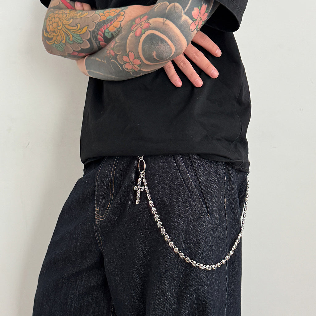 The Skull Wallet Chain is more than an accessory—it’s a wearable narrative of contrast and meaning. The skull links symbolize fearlessness and individuality, while the cross—crafted from the same motif—adds a layer of personal or spiritual symbolism. Wear it as a waist chain, cross-body accent, or layered with other pieces to create a look that is entirely your own. This Cross Wallet Chain is designed for those who dress with intention and carry their story with confidence.