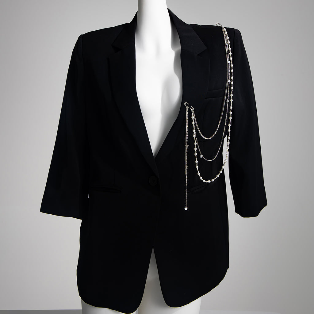 • Edgy Details: Safety-pin clasps add contemporary edge to feminine elements