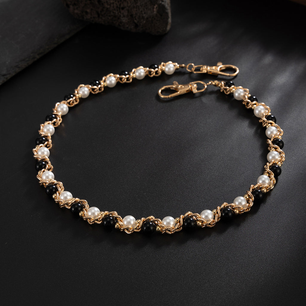 Introduce a touch of modern elegance and bold contrast with the Beaded Wallet Chain, a minimalist design that masterfully blends organic beauty with metallic structure. This unique Ball Wallet Chain features a 53cm strand of alternating black and white faux pearls, each individually wrapped in delicate gold-toned alloy wire. The pearls are then linked together by the same gleaming alloy chain, creating a seamless interplay of gold, white, and black—a visual harmony that is both striking and refined. This versatile Pearl Pants Chain is designed for those who appreciate the balance of soft and hard, light and dark, classic and contemporary.