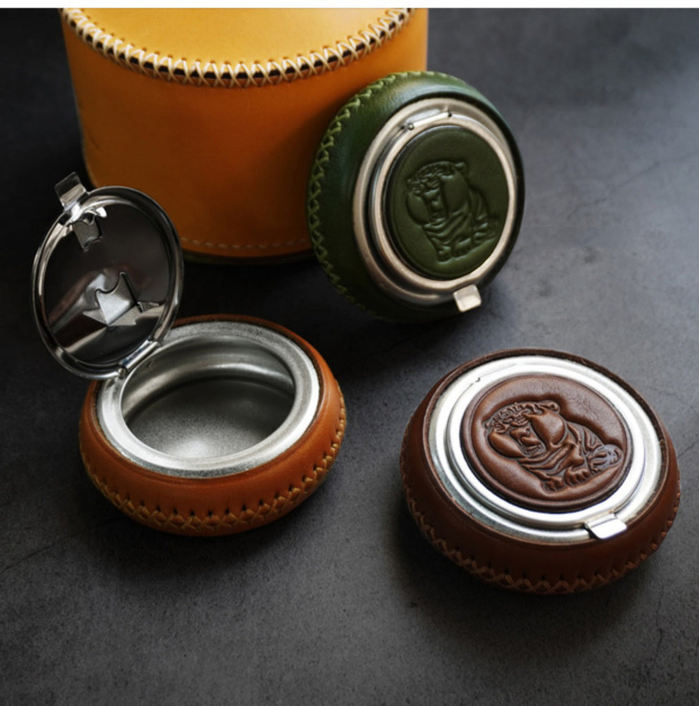 Design: Leather&Stainless Steel Portable Ashtray Travel Mens Ashtray Pocket Cute Around Ashtray for Men