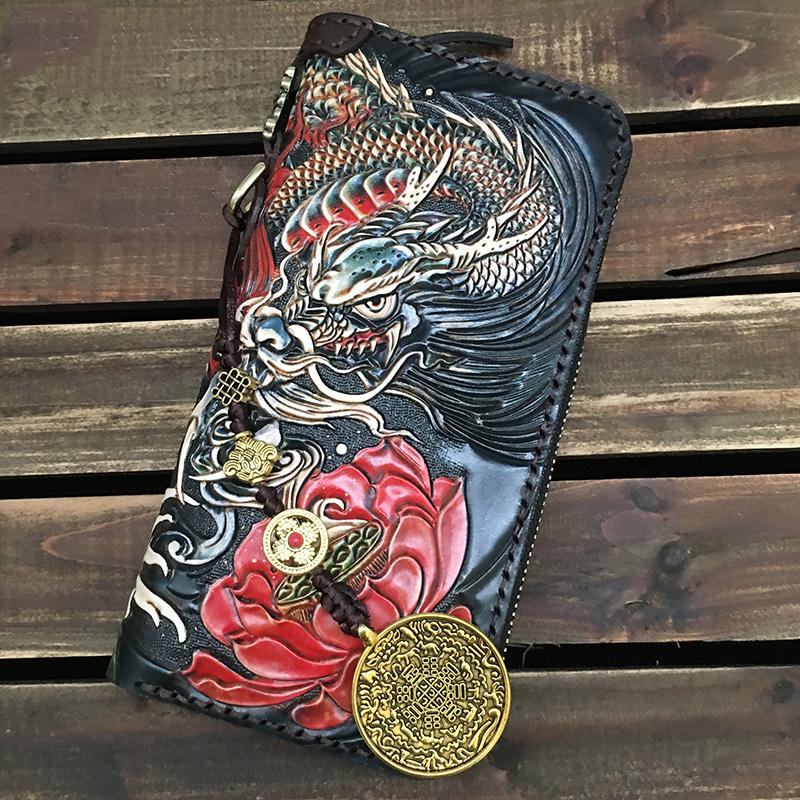 Design: Black Handmade Carp Toad Tooled Leather Long Biker Wallet Black Chain Wallet Clutch Wallet For Men
