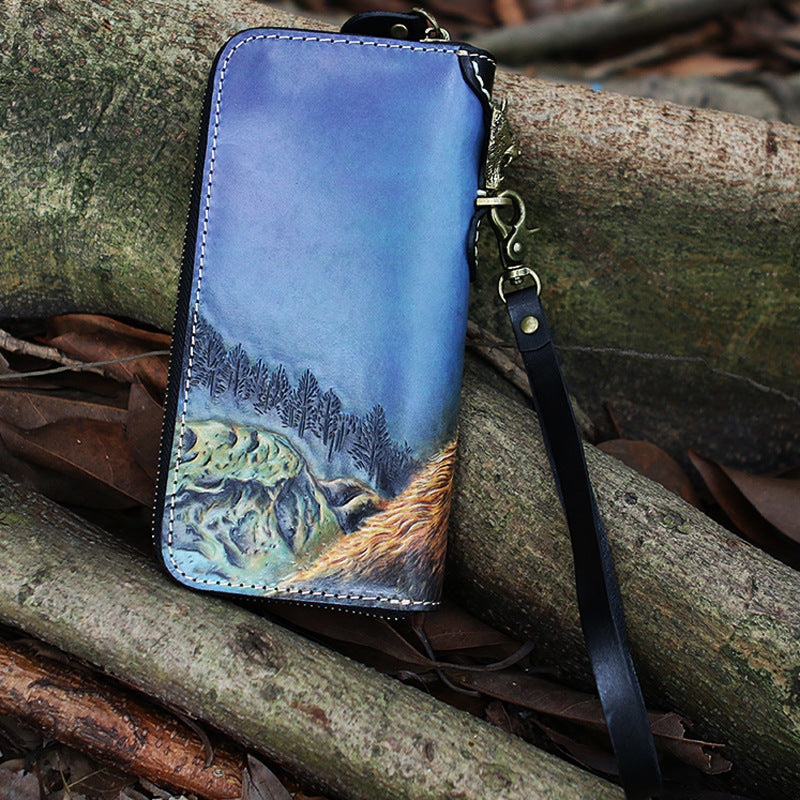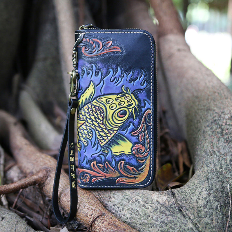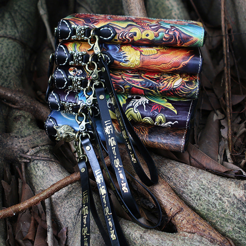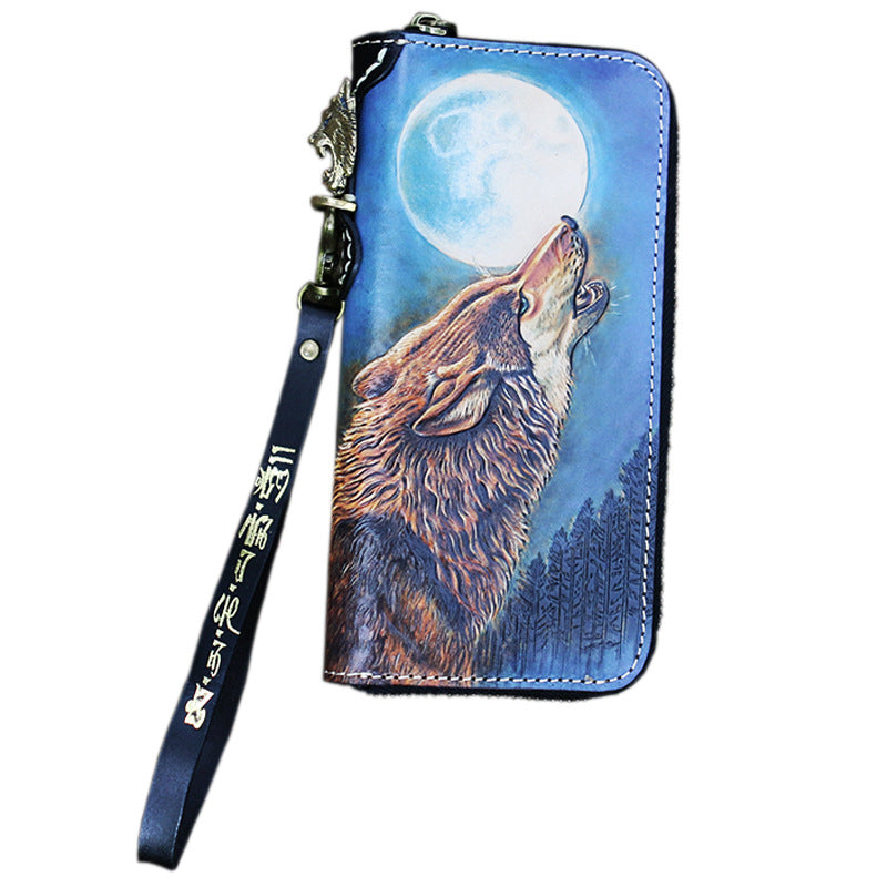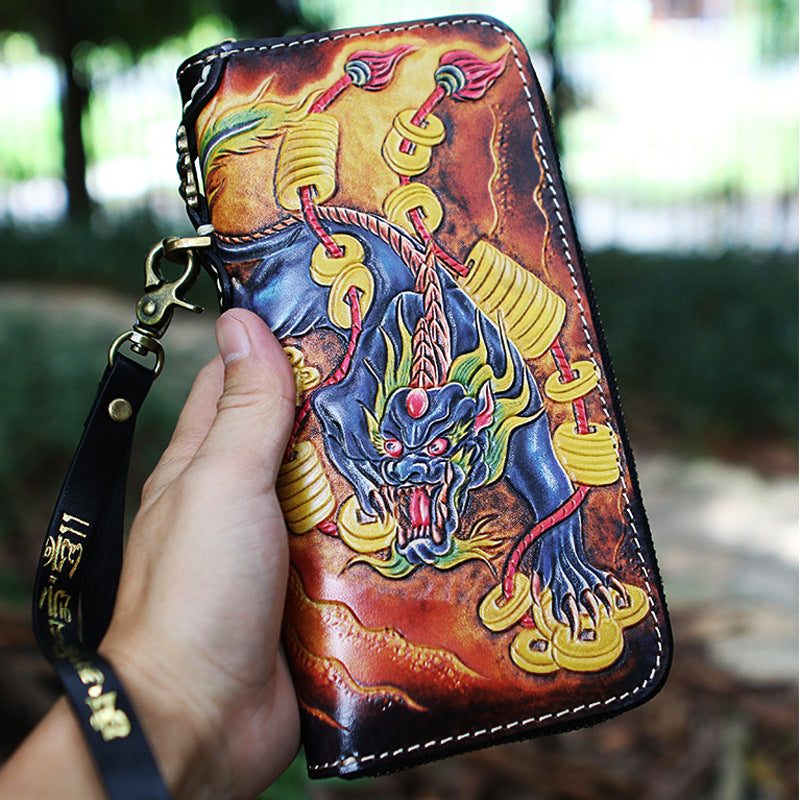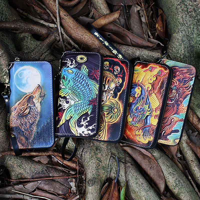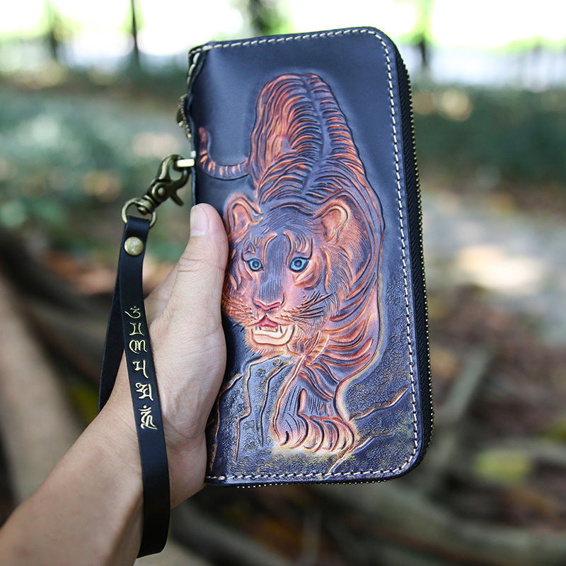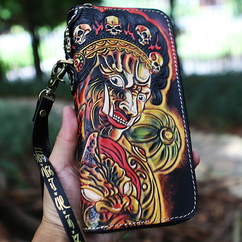 Style: Handmade Tooled Lion Leather Biker Chain Wallet Mens Long Wallet with Chain for Men