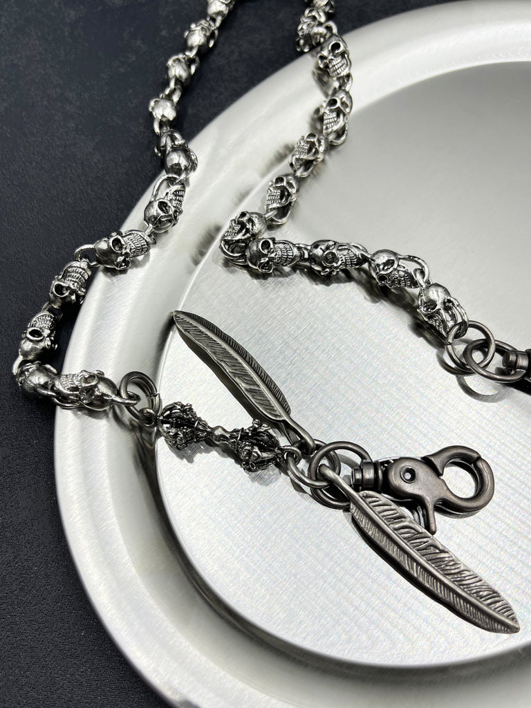 Unleash your inner rebel with this bold and distinctive Skull Chain for Wallet, a statement-making accessory crafted for those who embrace alternative fashion. This rugged Skull Wallet Chain features a striking design of interlinked zinc alloy skulls, each meticulously detailed to capture a gritty, edgy aesthetic. Measuring 64cm in total length, this robust Wallet Skull Chain is finished with two rebellious feather charms near the belt loop attachment, adding a touch of raw, free-spirited attitude to its already formidable presence.