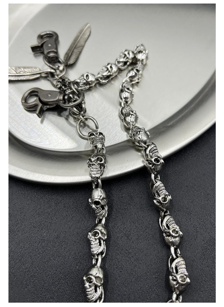 This Skull Wallet Chain is more than an accessory—it’s armor for the non-conformist. The linked skulls symbolize a fearless attitude, while the feathers hint at a spirit that can’t be caged. It’s built for the mosh pit, the open road, and the streets you claim as your own.