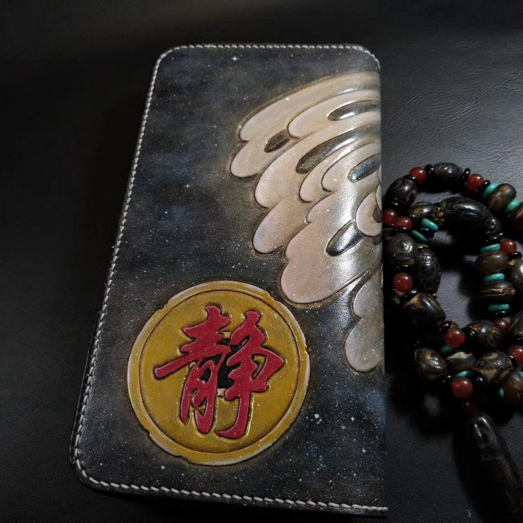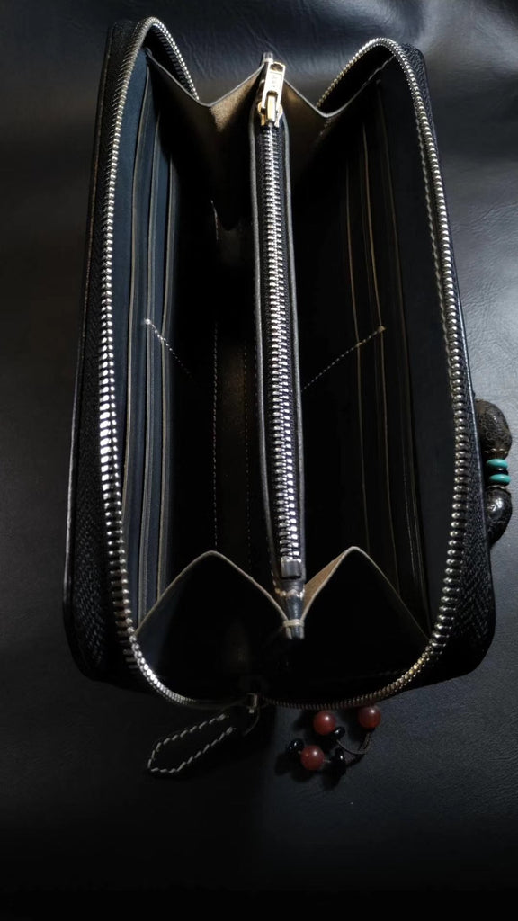 Style: Badass Black Leather Men's Dragon Long Biker Wallet Handmade Tooled Zipper Long Wallets For Men