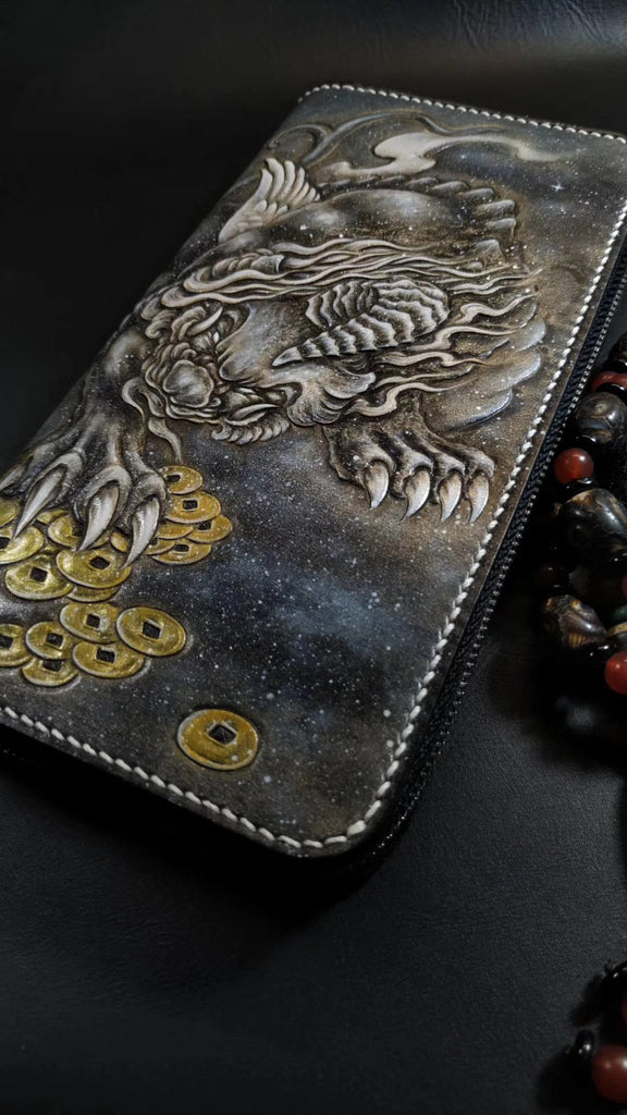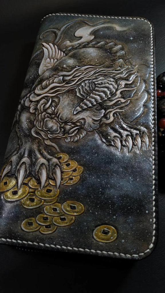 Design: Badass Black Leather Men's Dragon Long Biker Wallet Handmade Tooled Zipper Long Wallets For Men