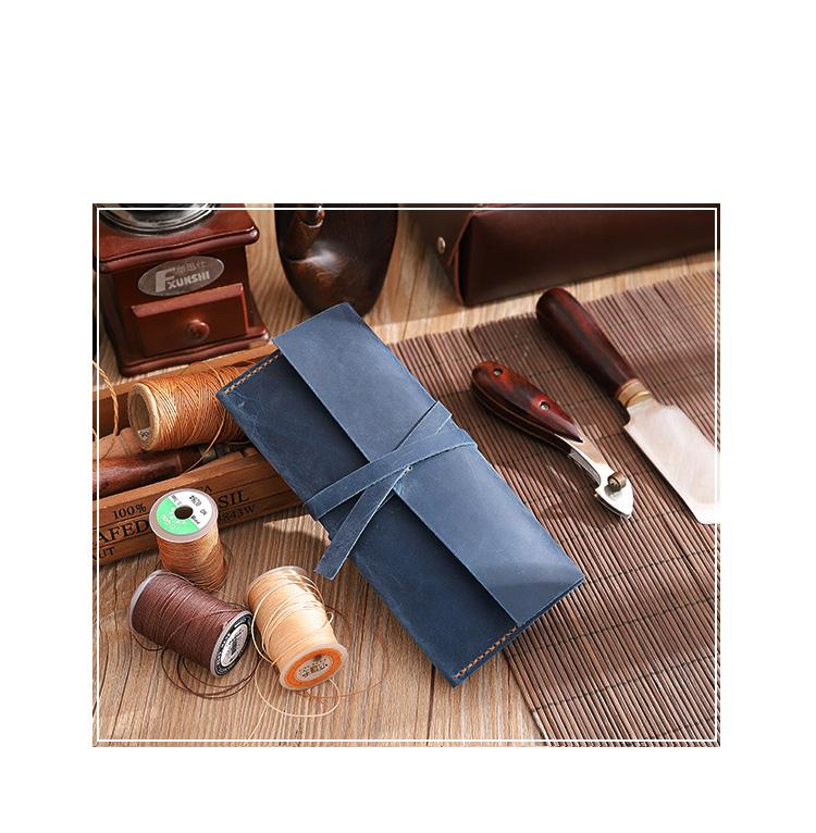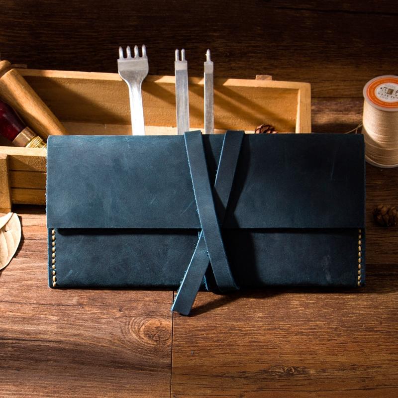 Handmade Blue Leather Womens Long Wallets Personalized Wrap Tie Checkbook Wallet for Men