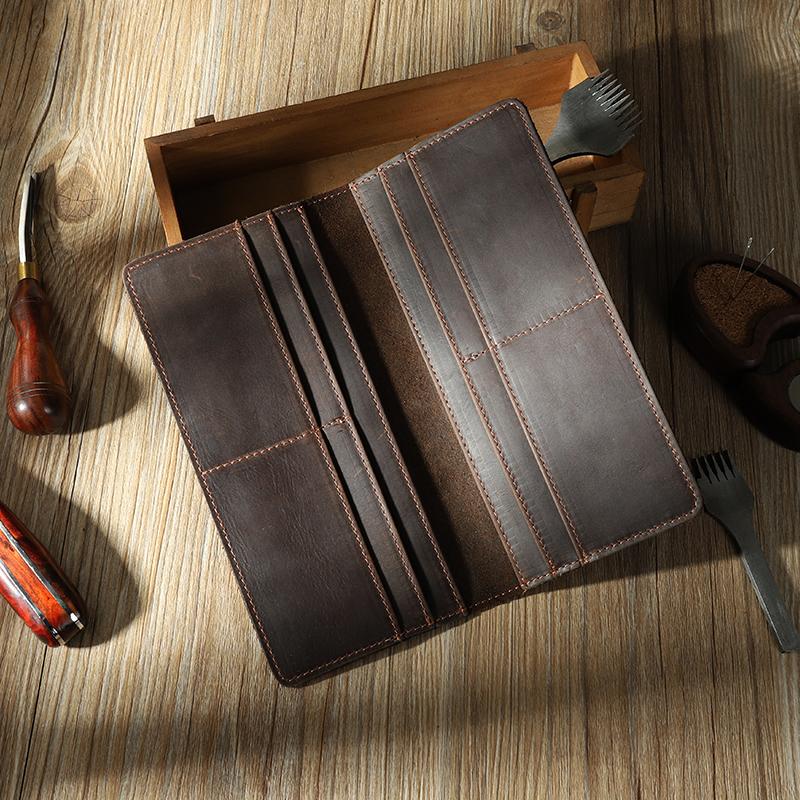 Handmade Coffee Slim Leather Mens Bifold Long Wallet Personalized Black Checkbook Wallets for Men