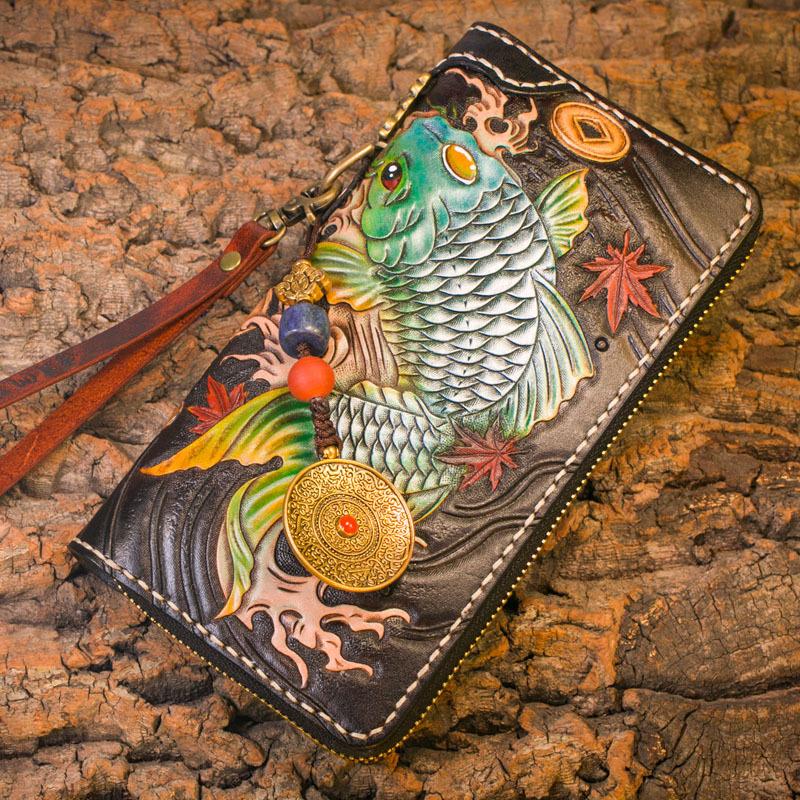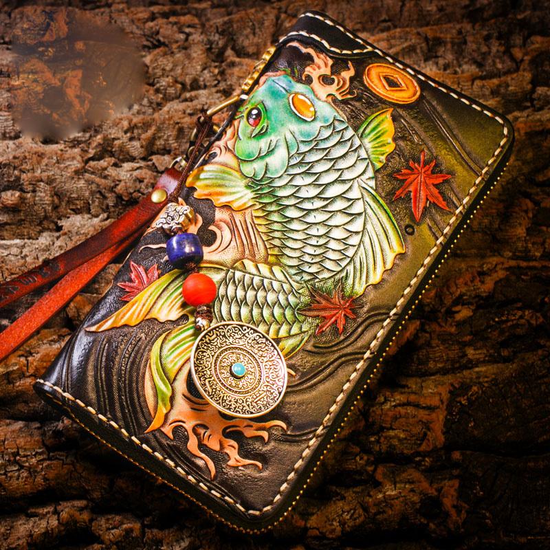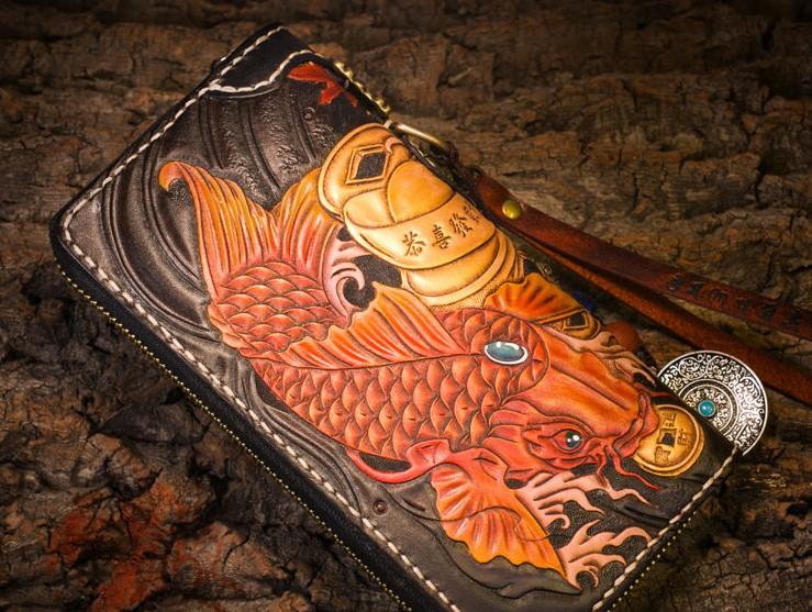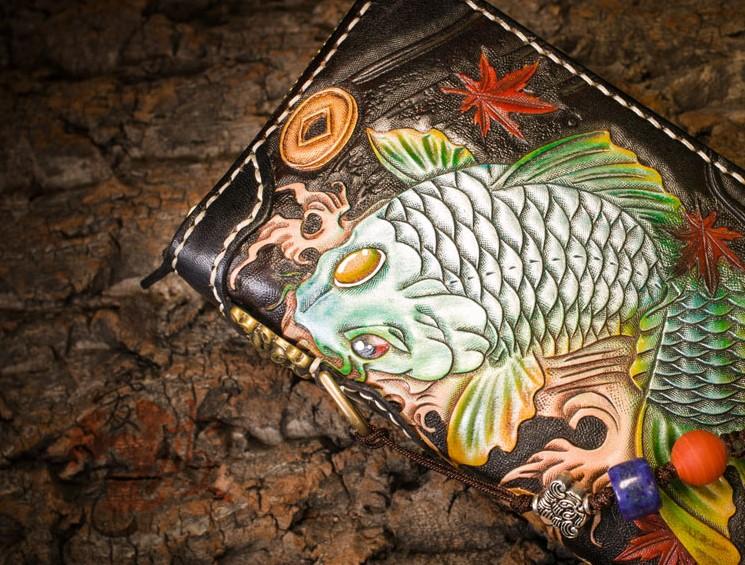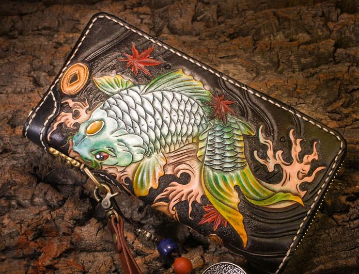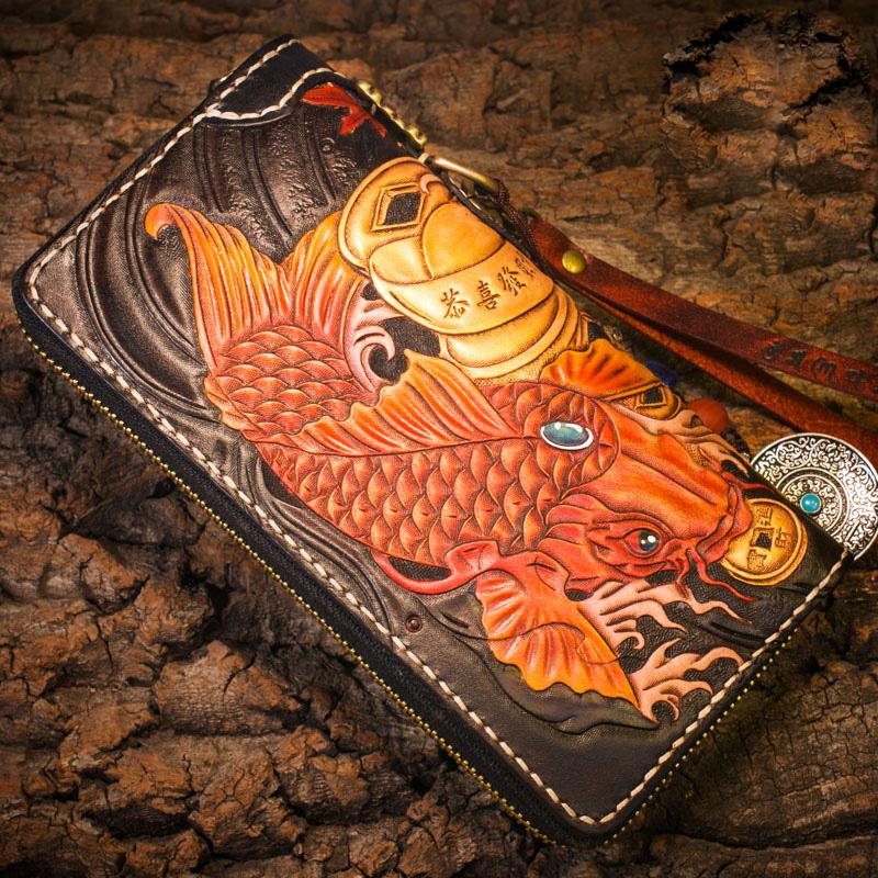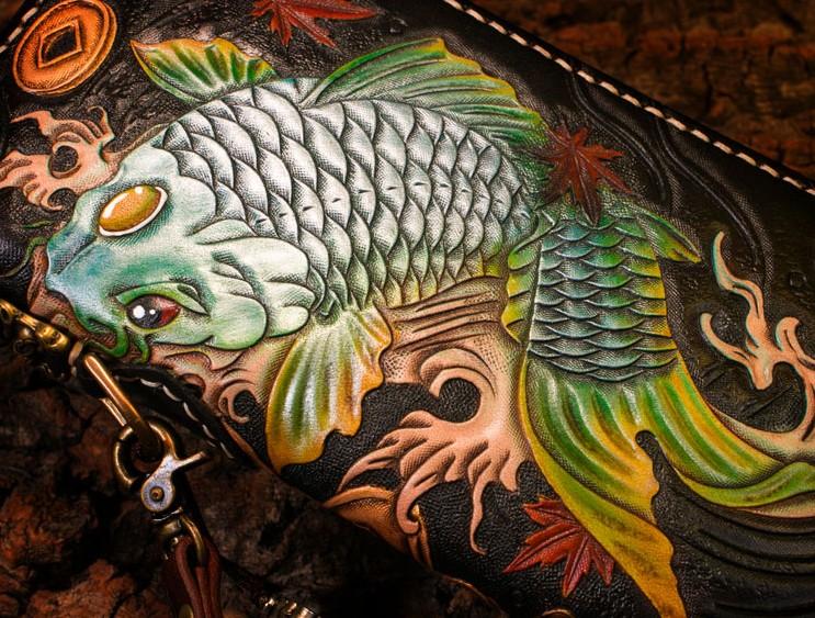 Style: Handmade Leather Carp Mens Chain Biker Wallet Cool Leather Wallet Long Clutch Wallets for Men