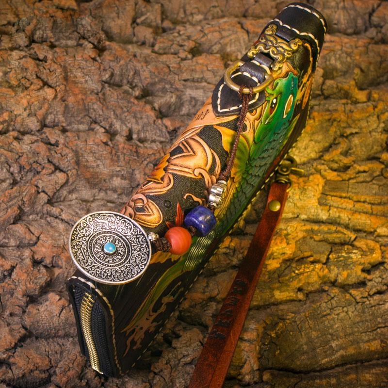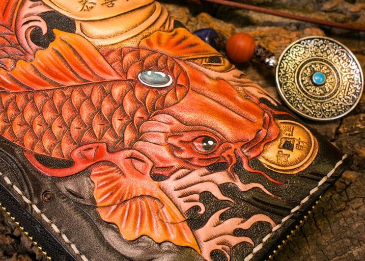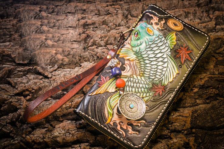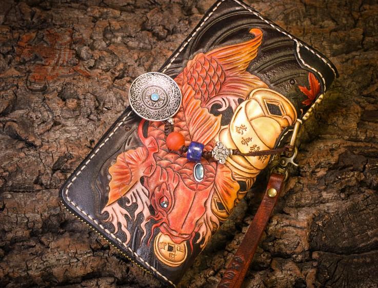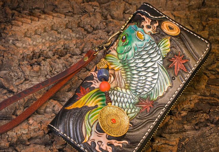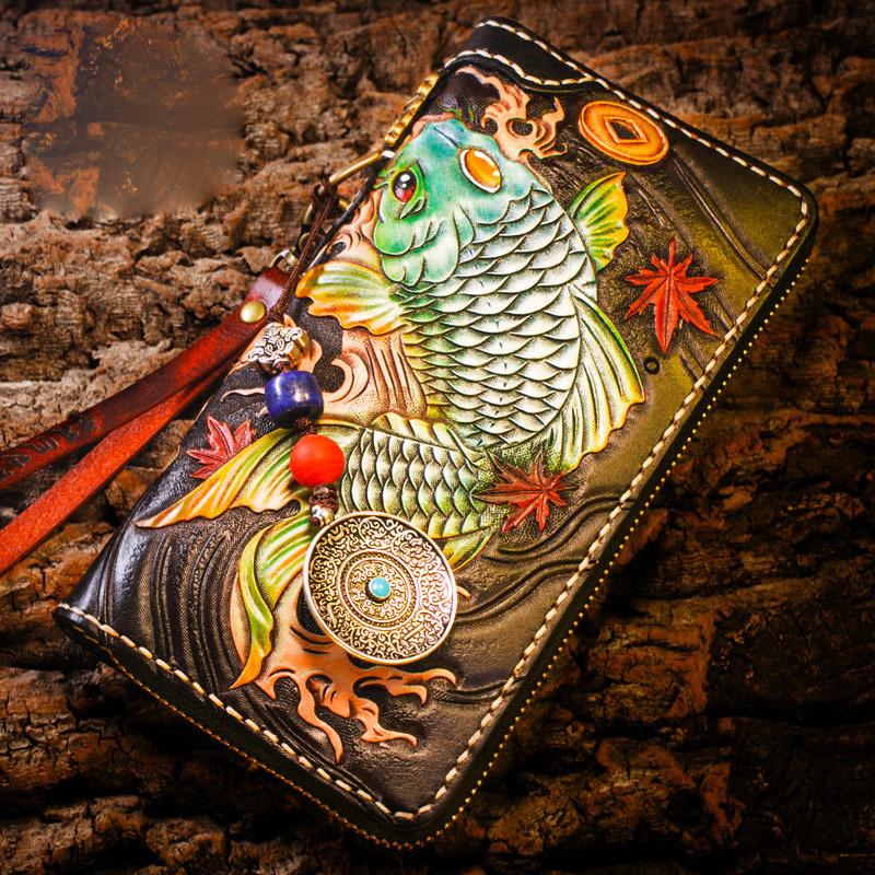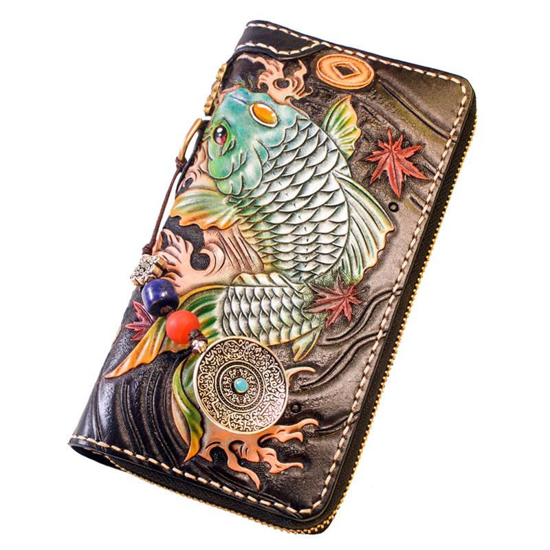 Style: Handmade Leather Carp Mens Chain Biker Wallet Cool Leather Wallet Long Clutch Wallets for Men