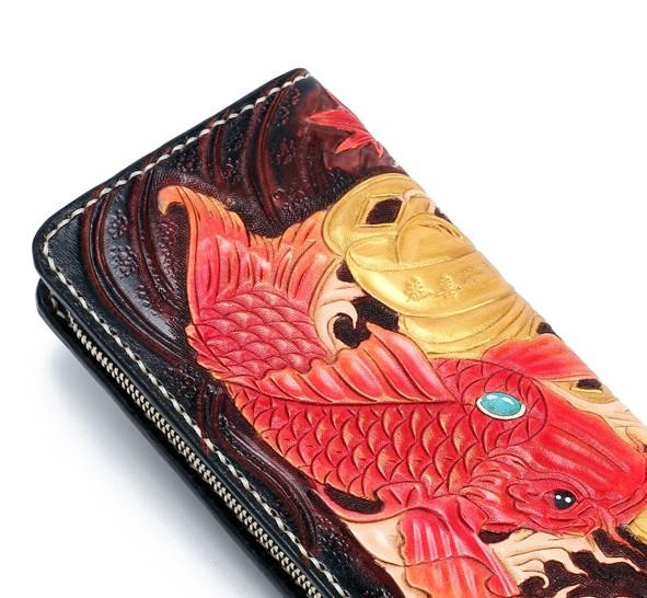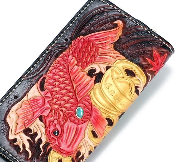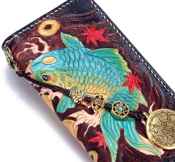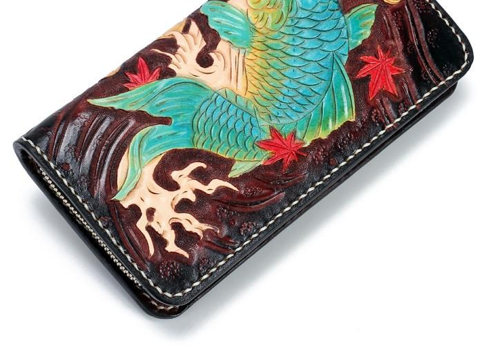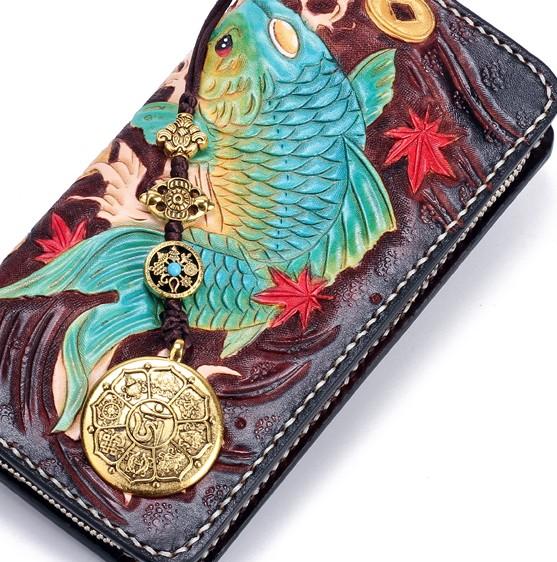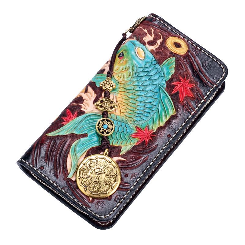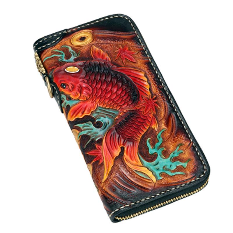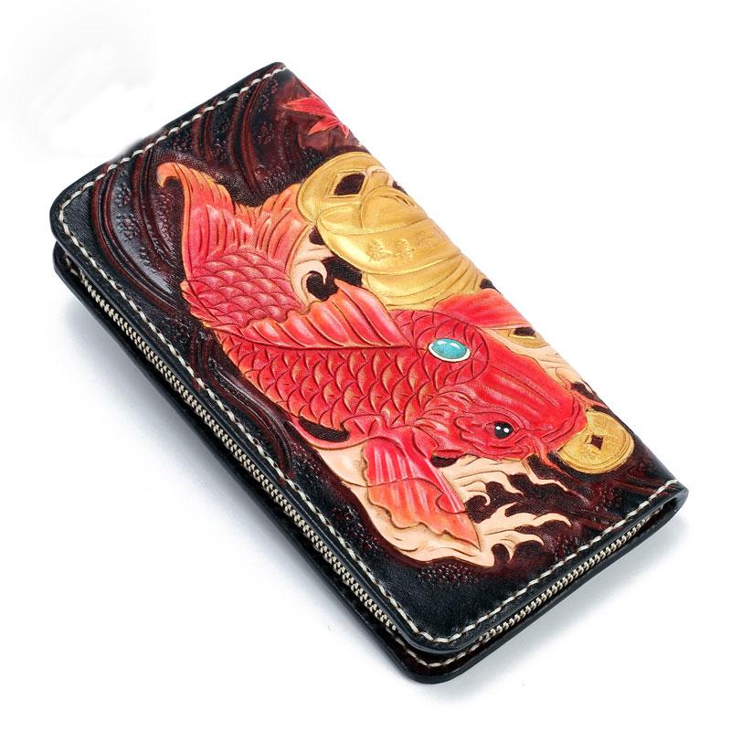 Handmade Leather Carp Mens Tooled Long Chain Biker Wallet Cool Leather Wallet Long Phone Wallets for Men