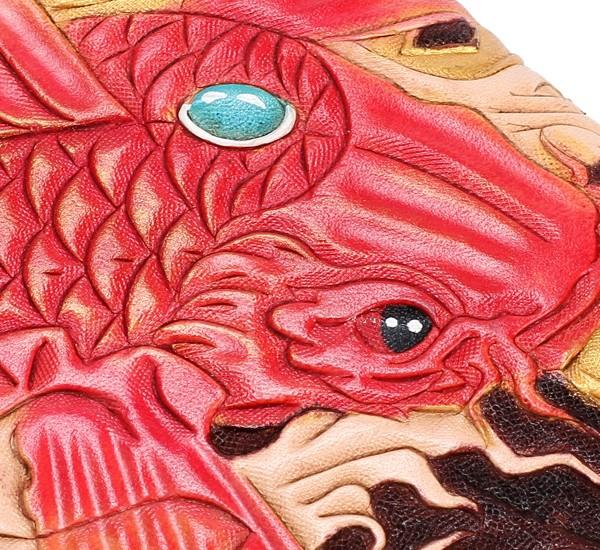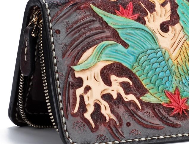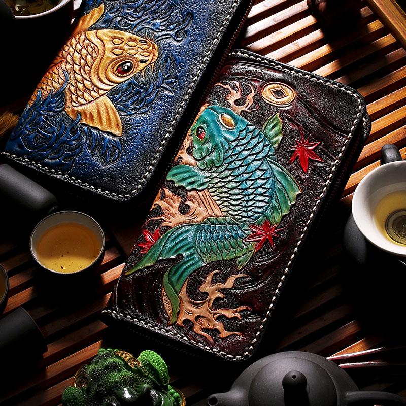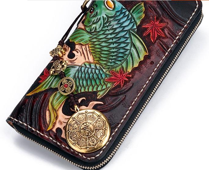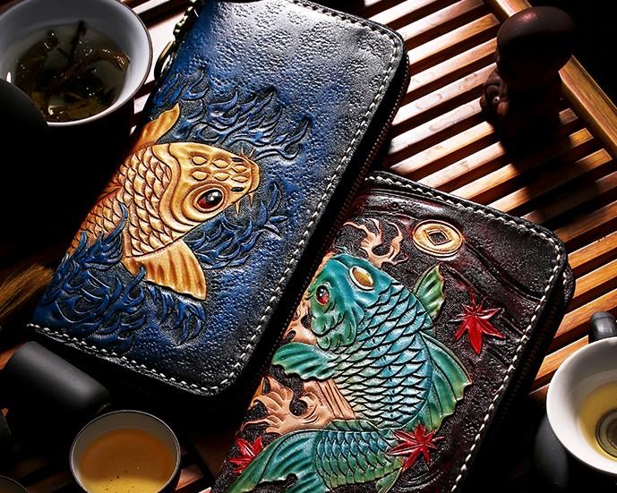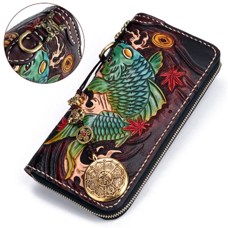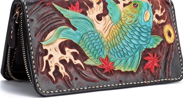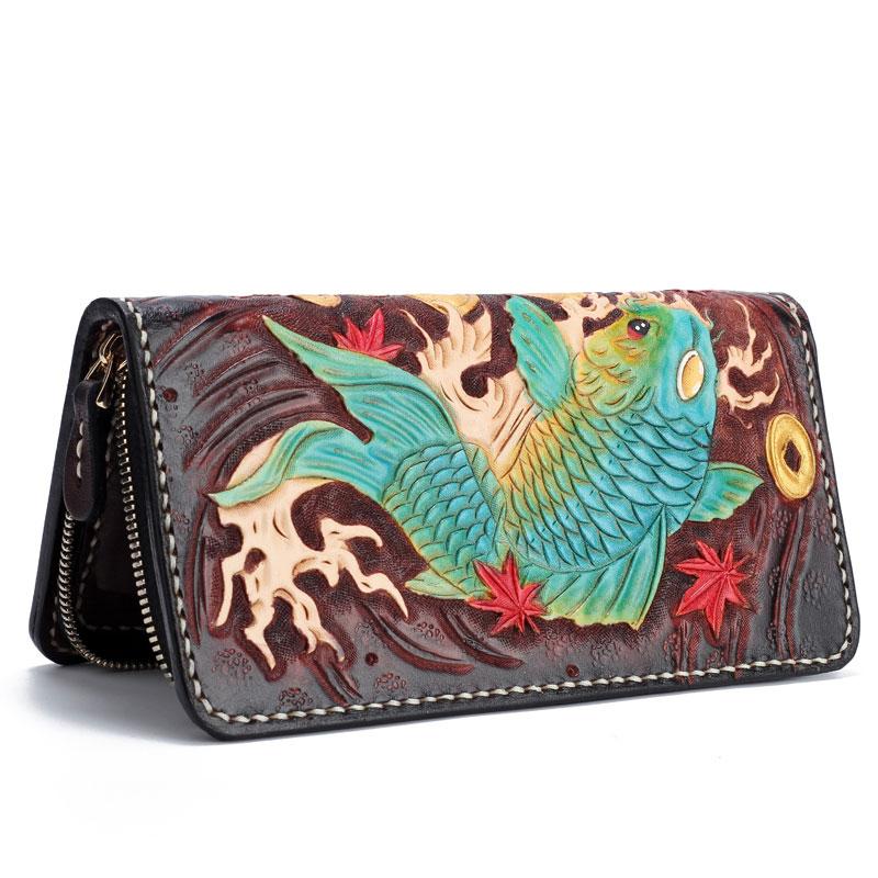 Handmade Leather Carp Mens Tooled Long Chain Biker Wallet Cool Leather Wallet Long Phone Wallets for Men