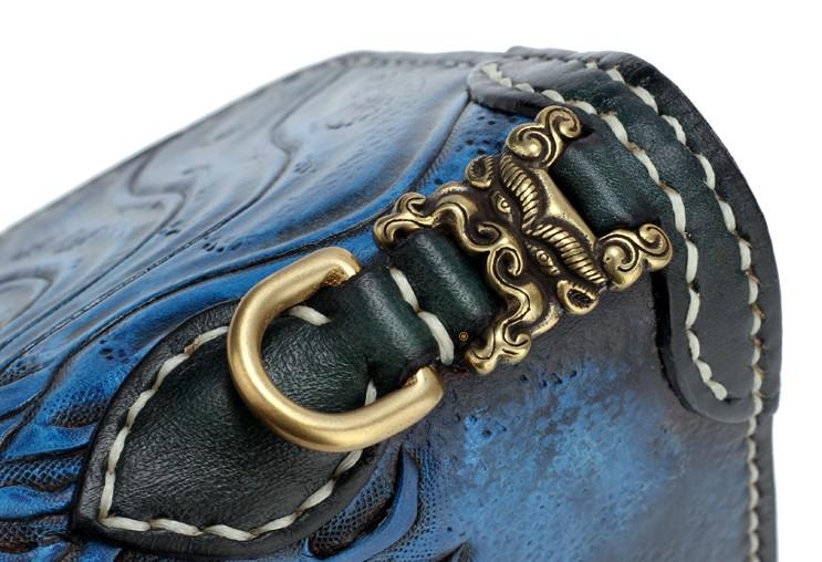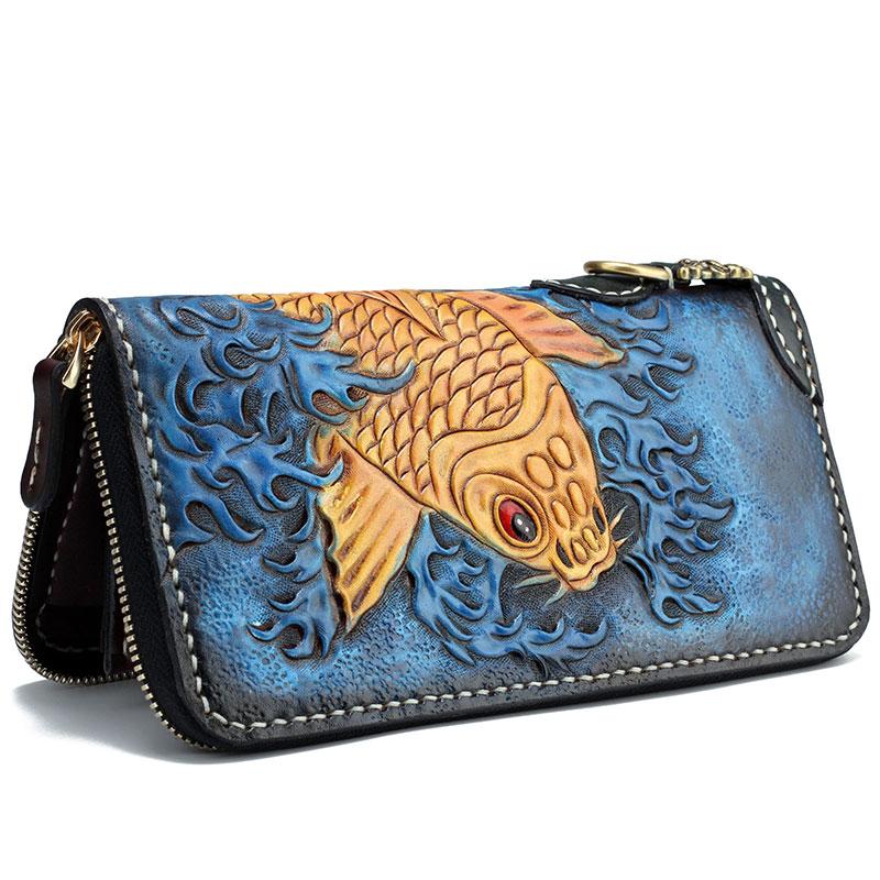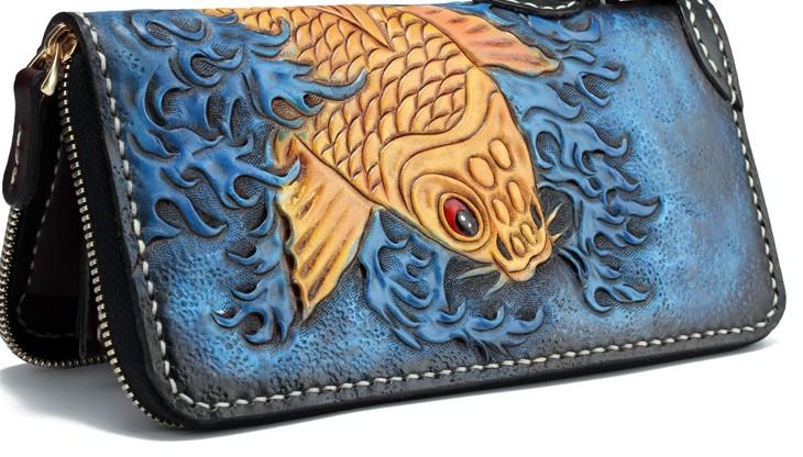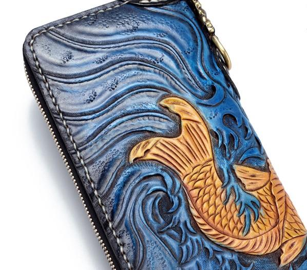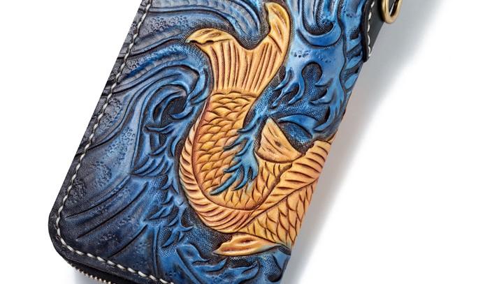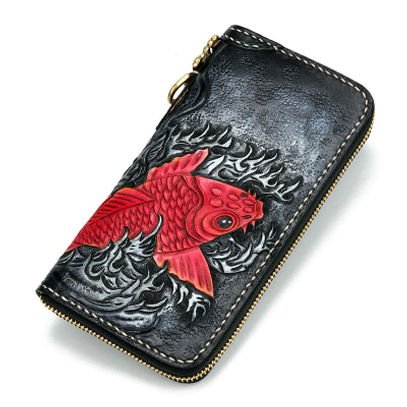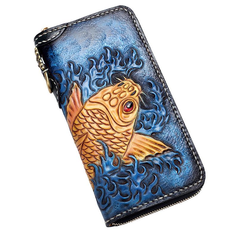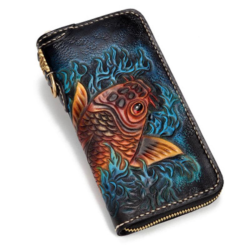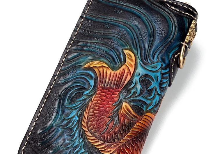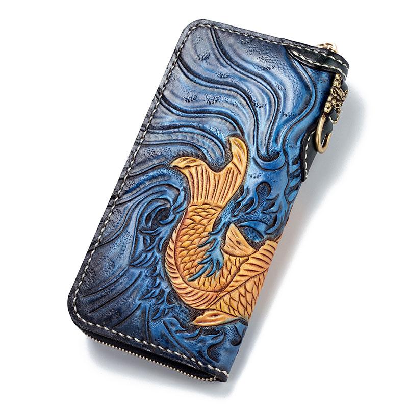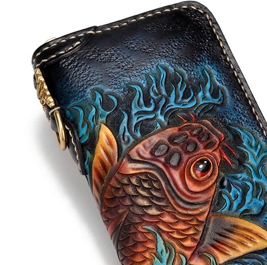 Handmade Leather Carp Mens Tooled Long Chain Biker Wallet Cool Leather Wallet Long Phone Wallets for Men