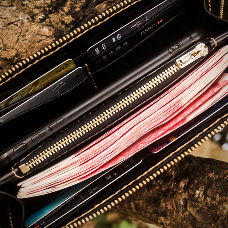 Slots: 2 full size bill slot, 12 card holders, 1 zipper slot