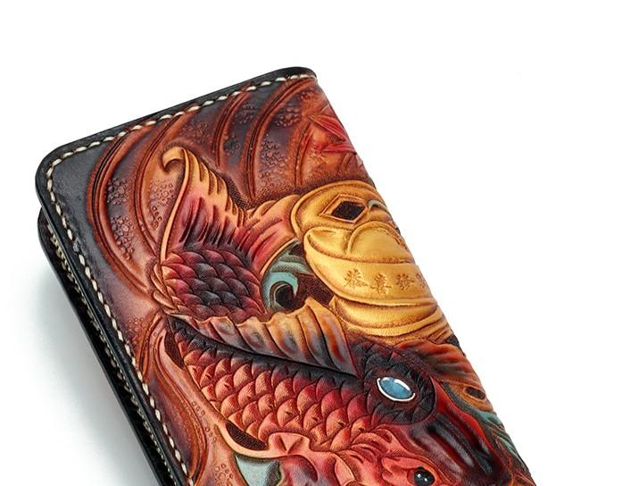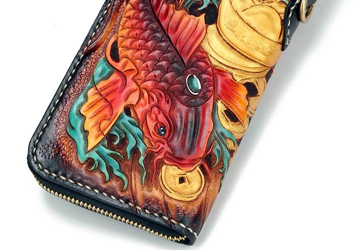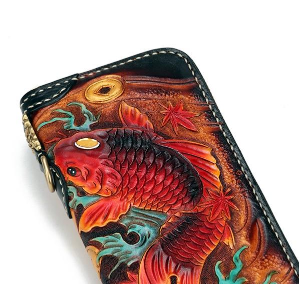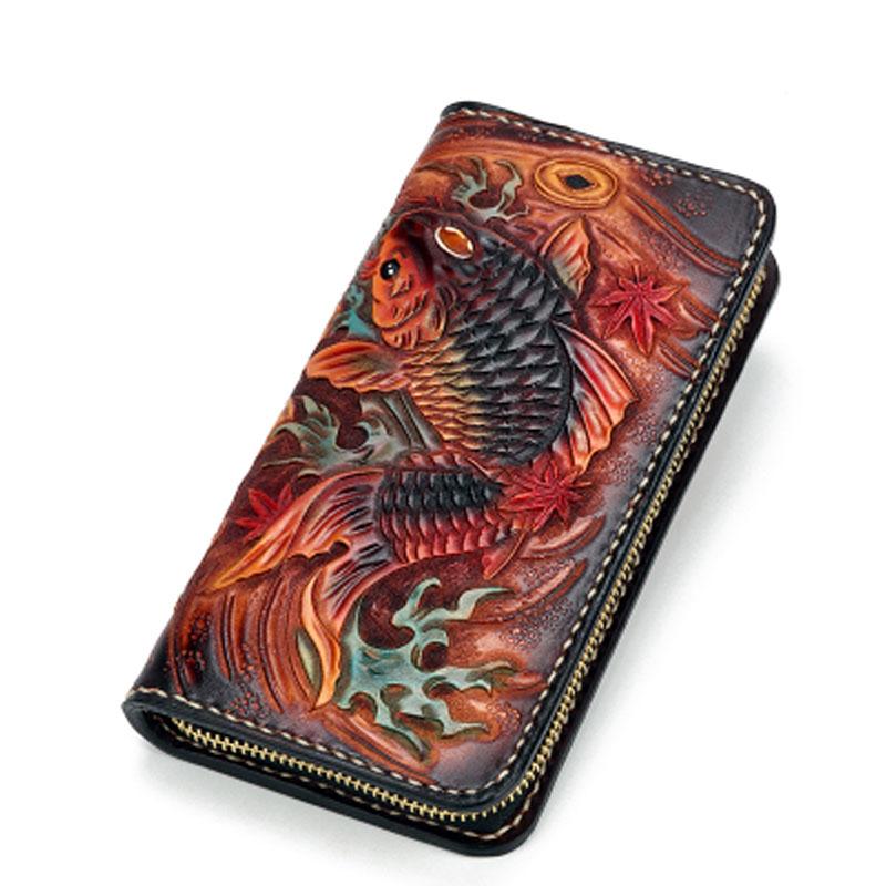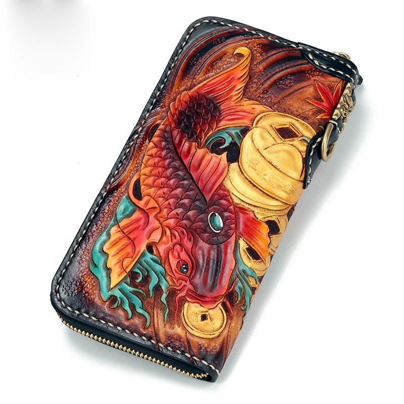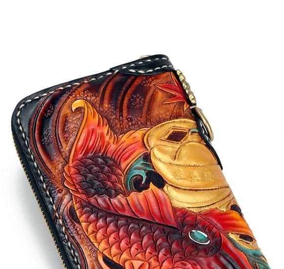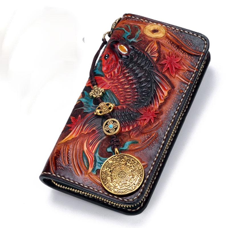 Design: Handmade Leather Carp Mens Chain Zipper Biker Wallet Cool Leather Wallet Long Phone Wallets for Men