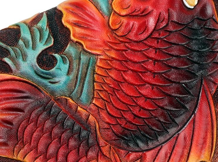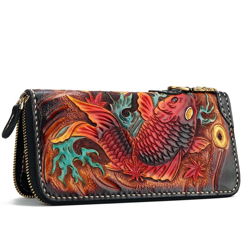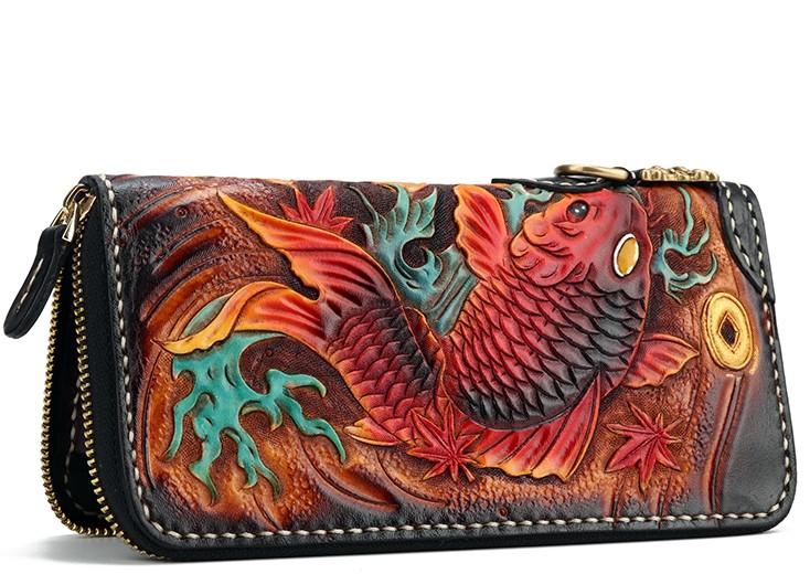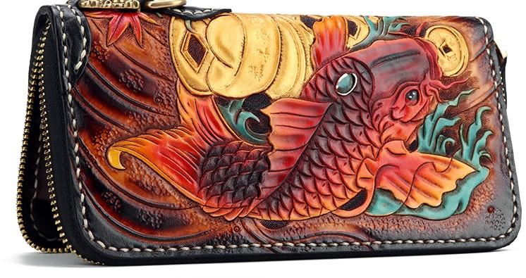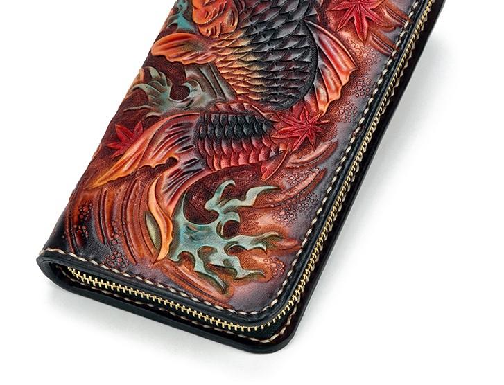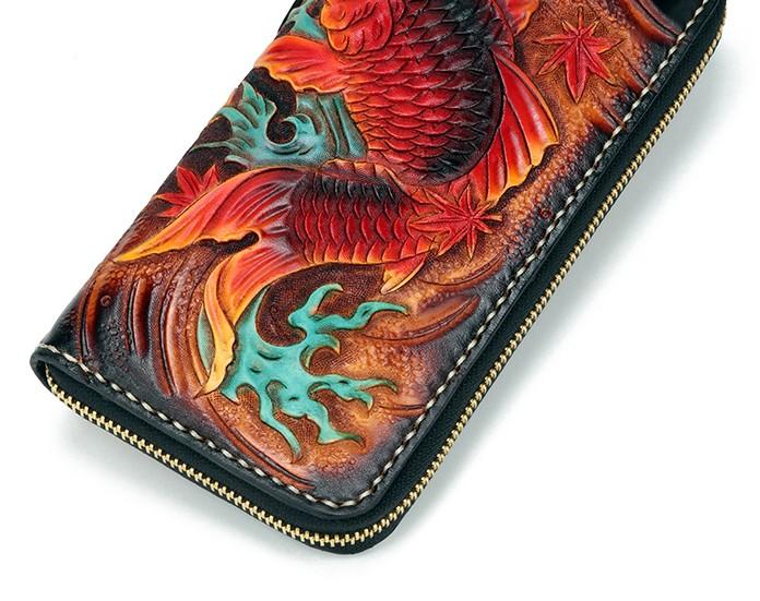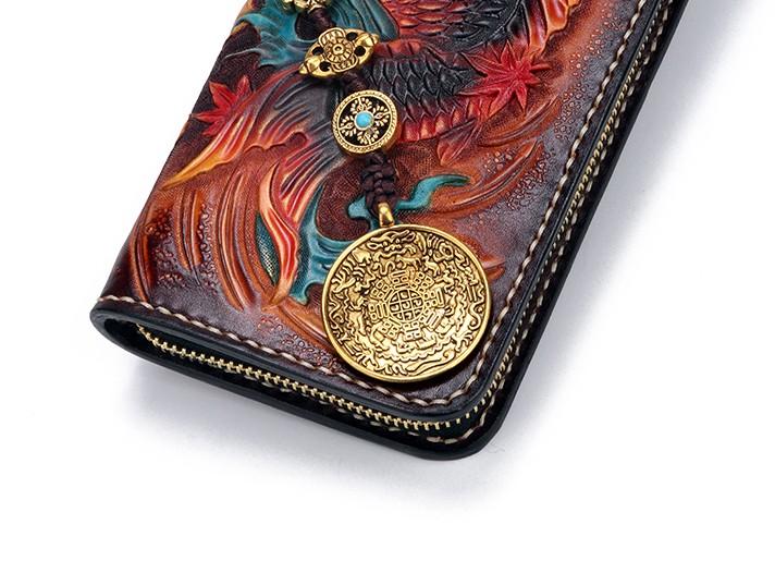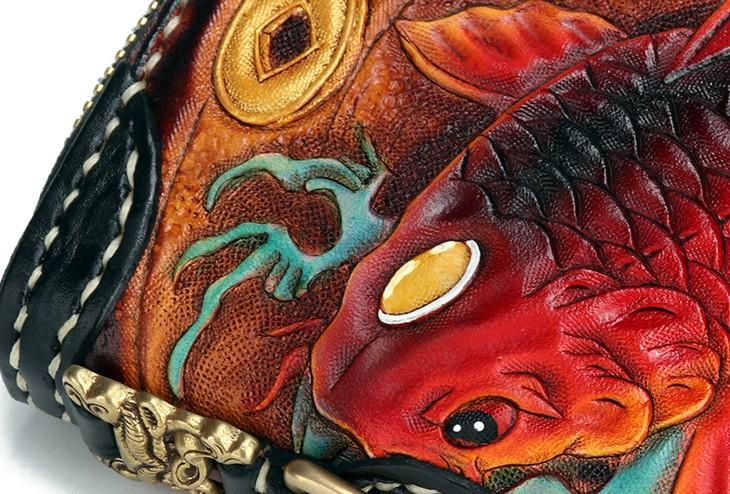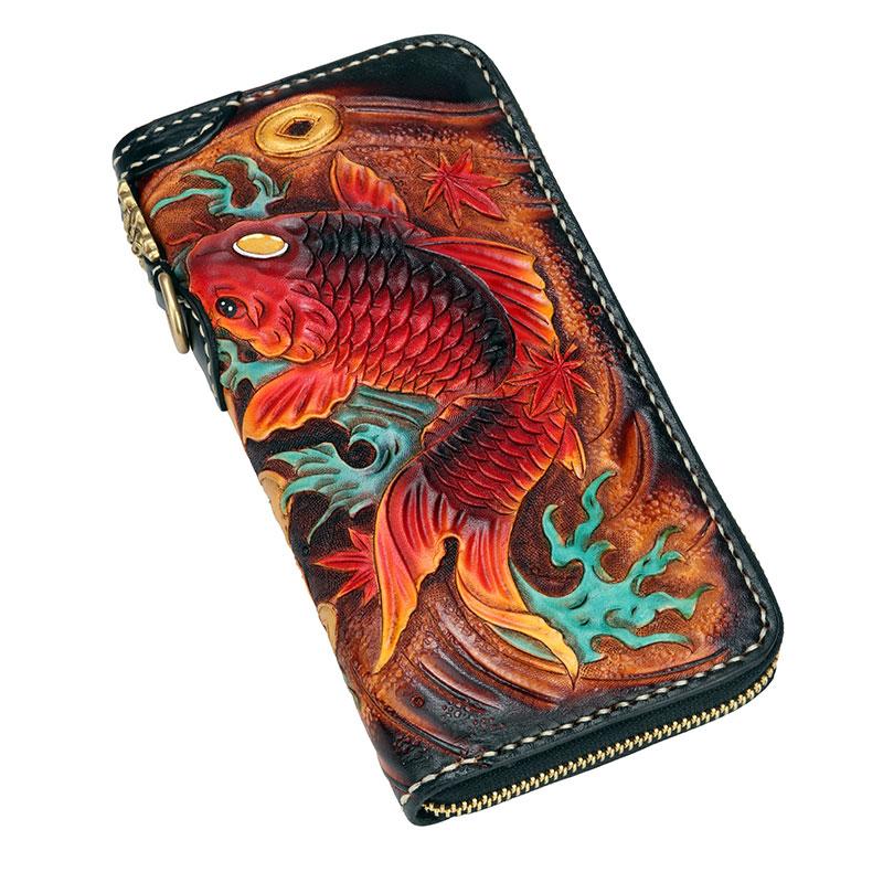 Design: Handmade Leather Carp Mens Chain Zipper Biker Wallet Cool Leather Wallet Long Phone Wallets for Men