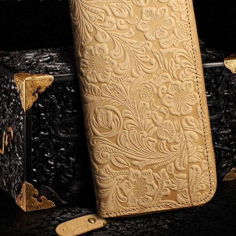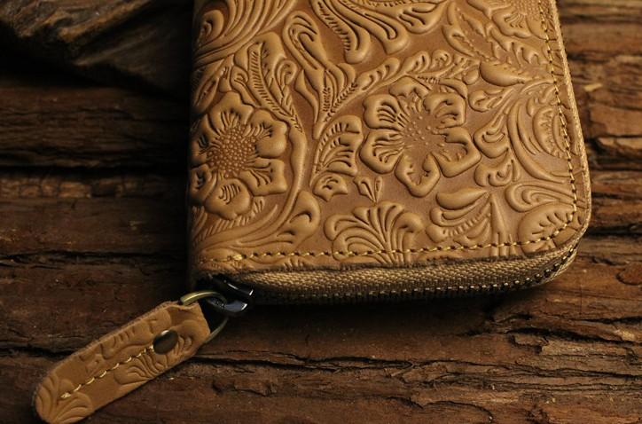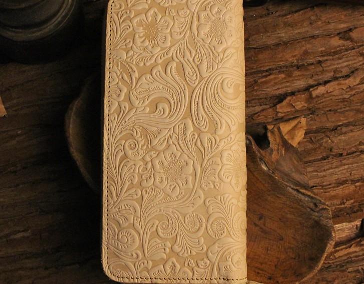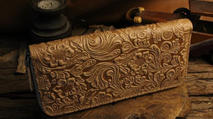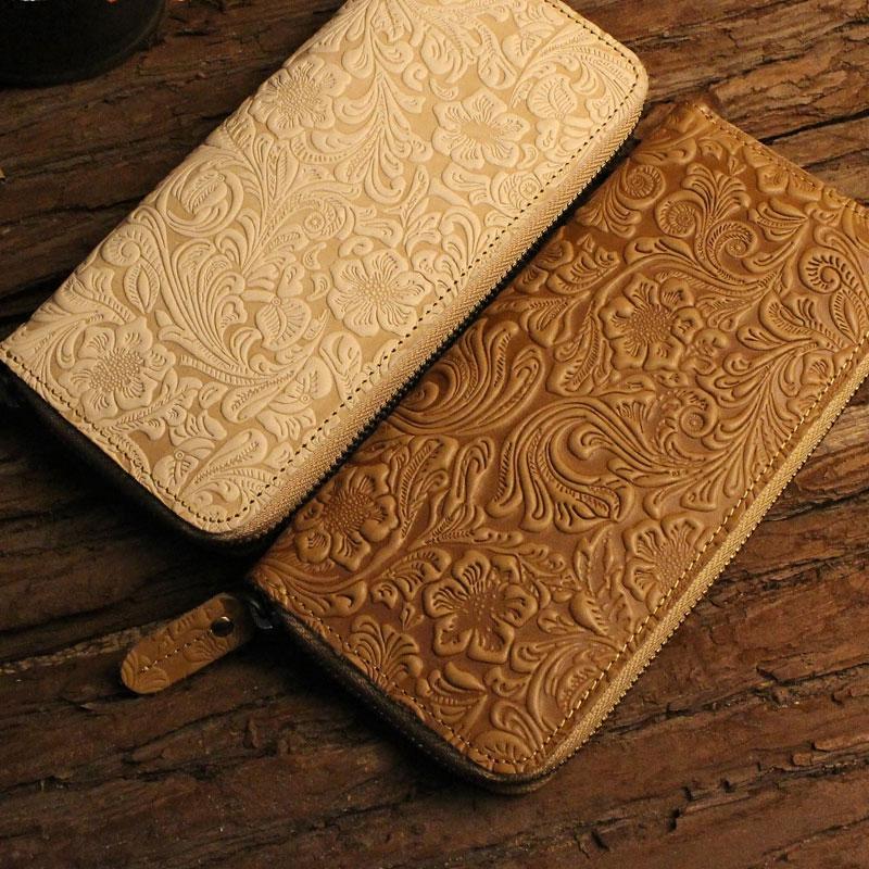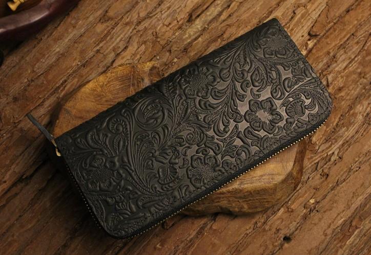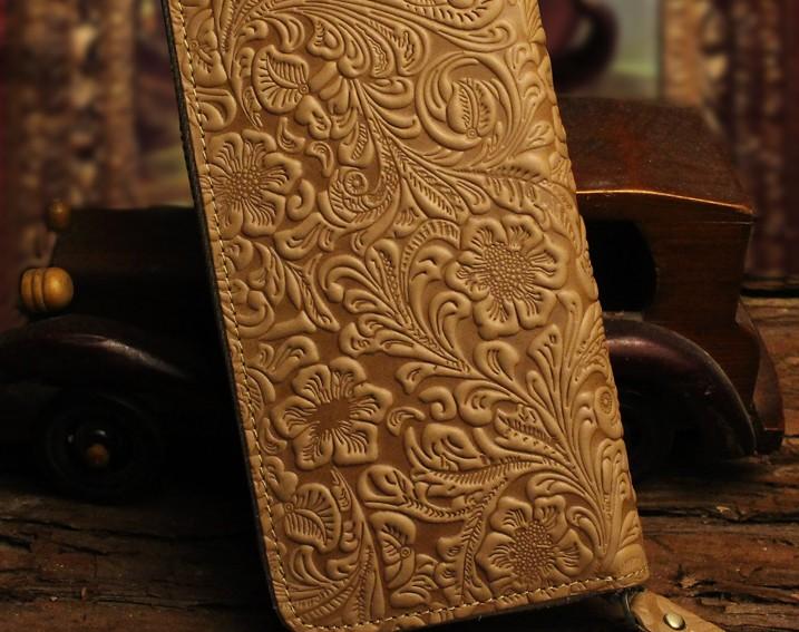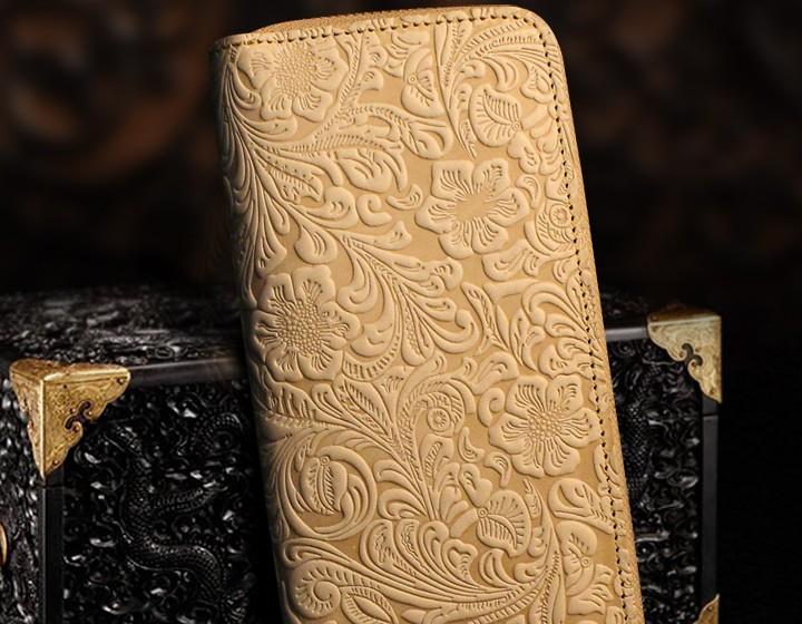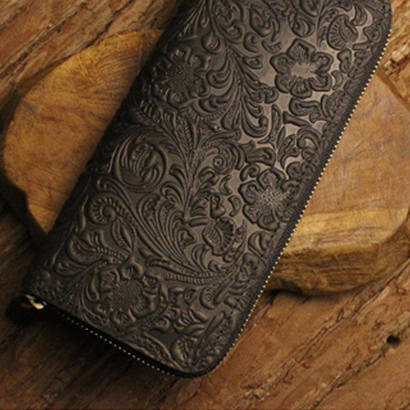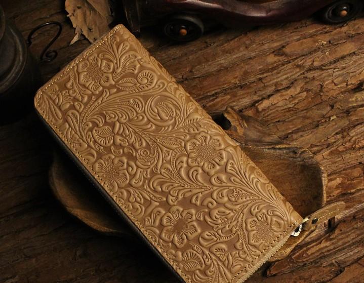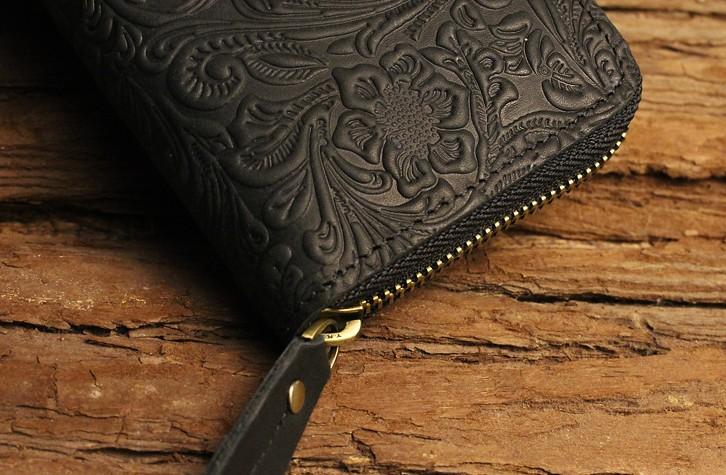Design: Handmade Leather Floral Mens Cool Zipper Phone Travel Long Wallet Card Holder Card Slim Clutch Wallets for Men