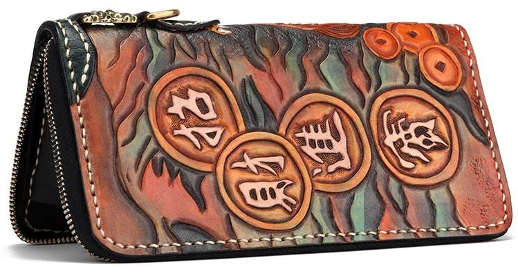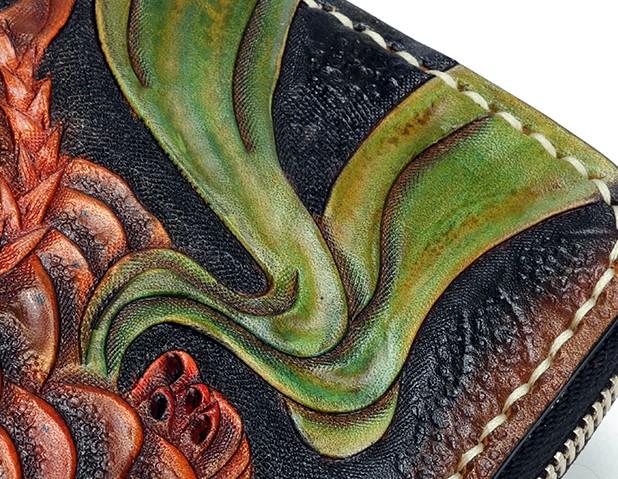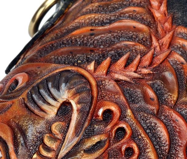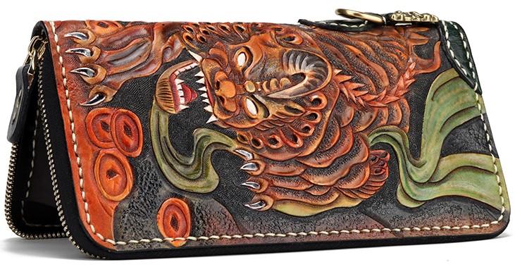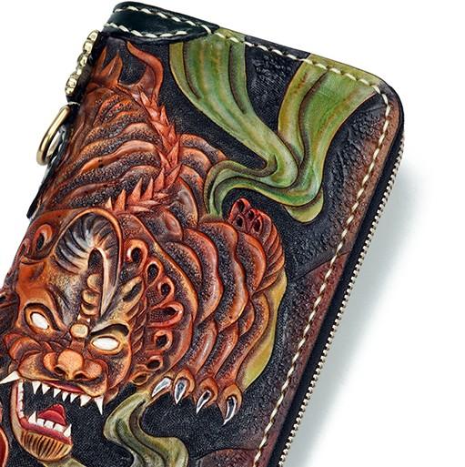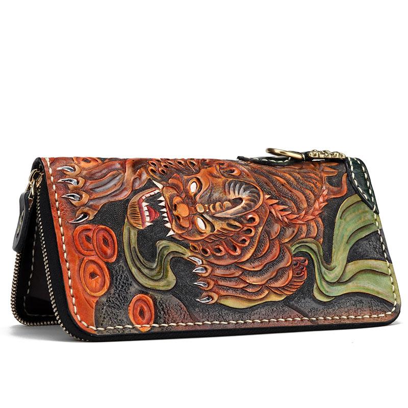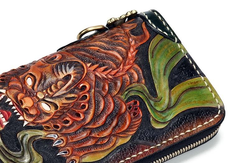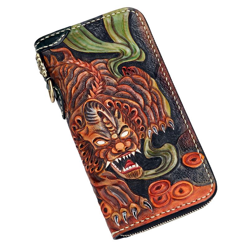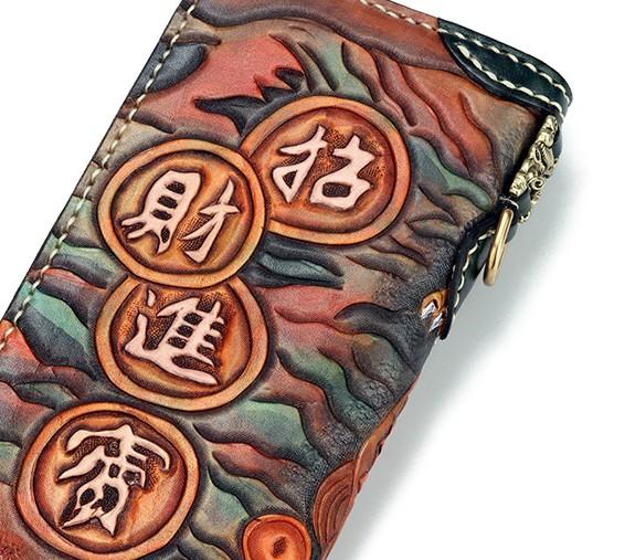 Handmade Leather Fortune Pixiu Mens Tooled Long Chain Biker Wallet Cool Leather Wallet With Chain Wallets for Men