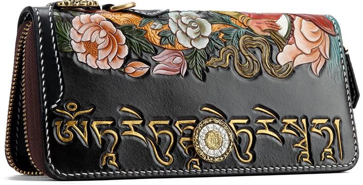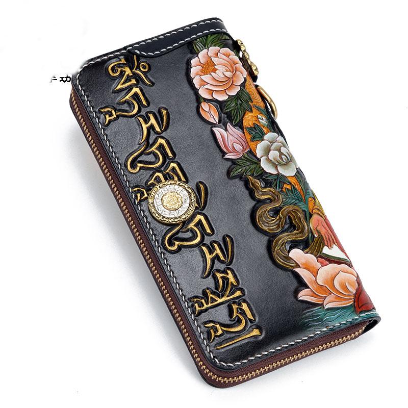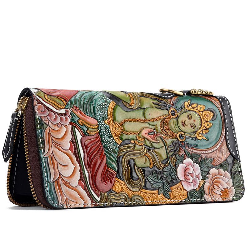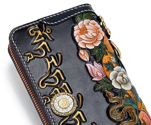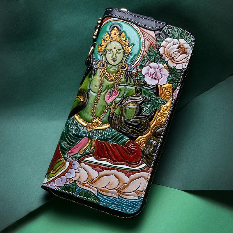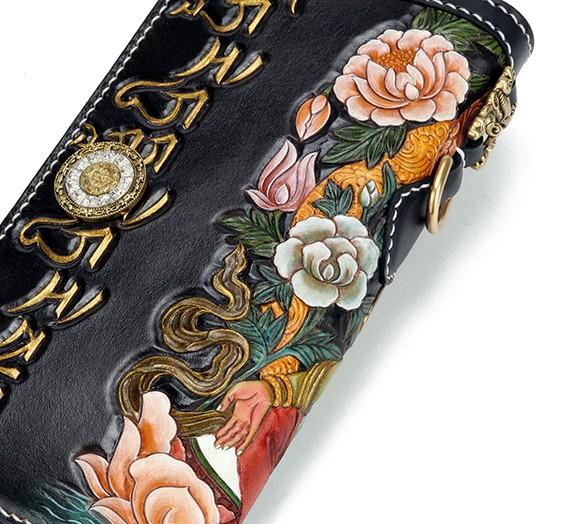 Handmade Leather Green Tara Buddhism Mens Tooled Long Biker Wallet Cool Leather Wallet With Chain Wallets for Men