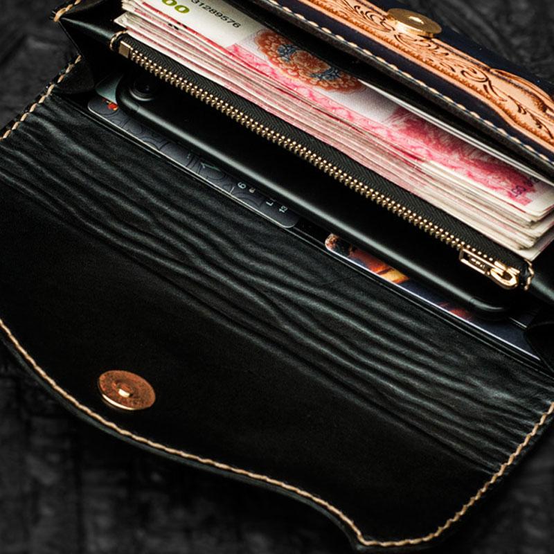 Style: Handmade Leather Men Tooled Blue Floral Cool Leather Wallet Long Phone Clutch Wallets for Men