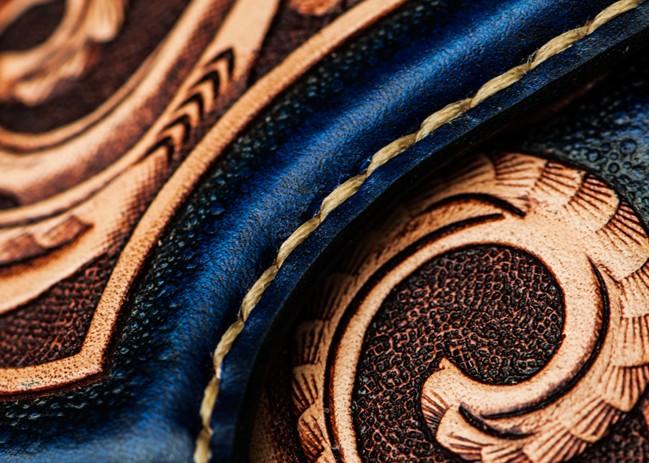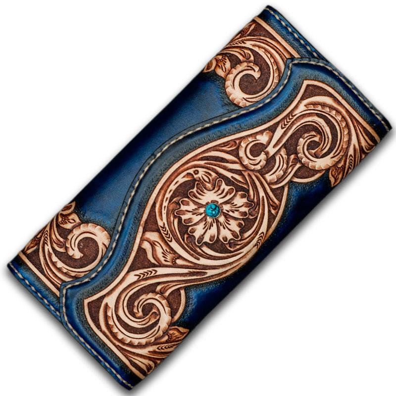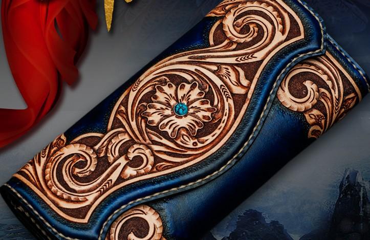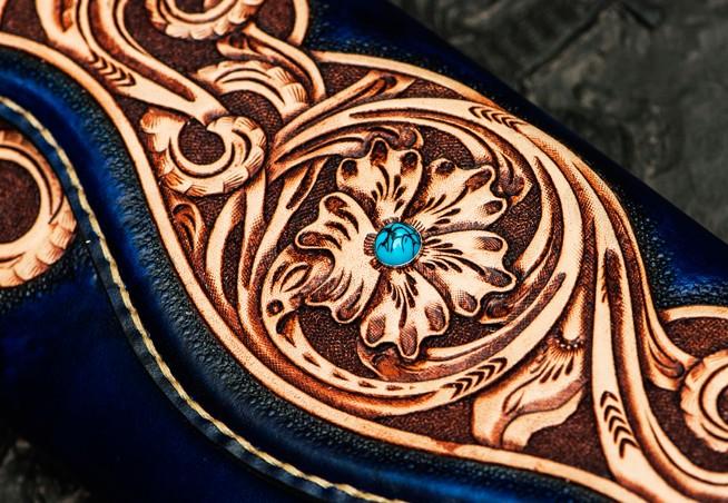 Design: Handmade Leather Men Tooled Blue Floral Cool Leather Wallet Long Phone Clutch Wallets for Men