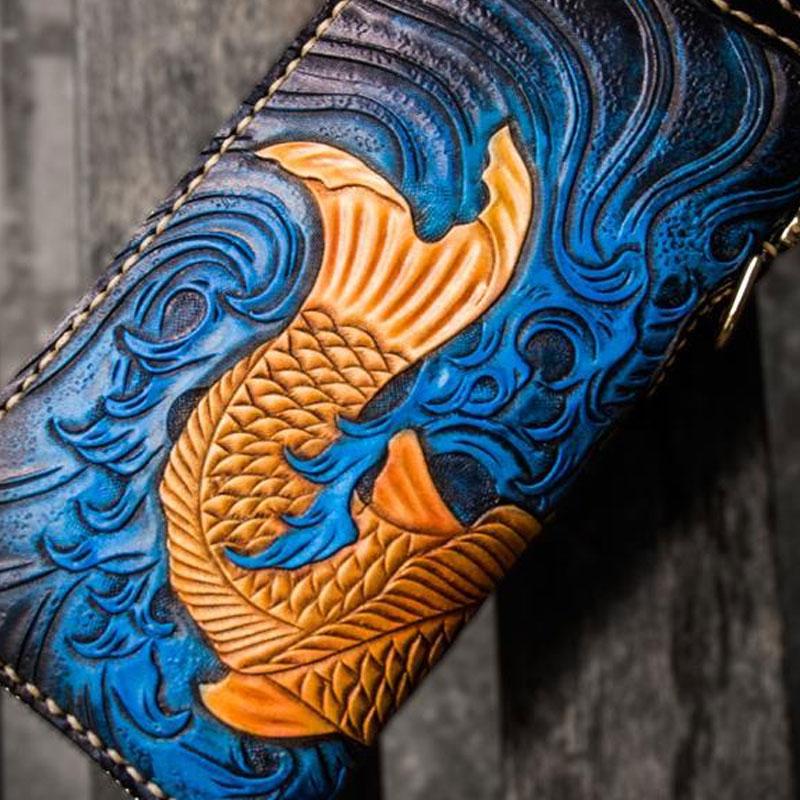 Style: Handmade Leather Men Tooled Carp Cool Leather Wallet Long Phone Wallets for Men
