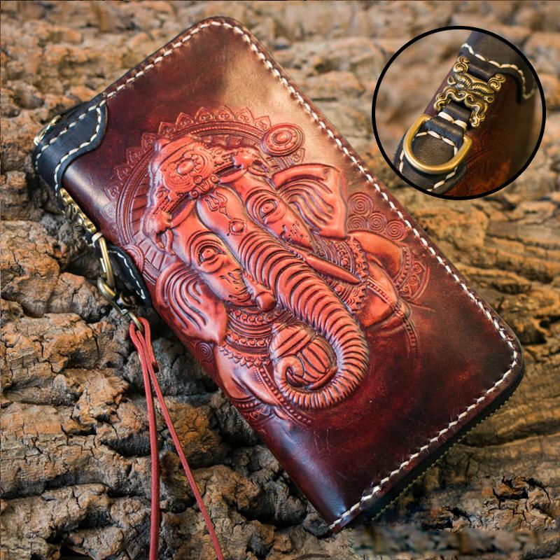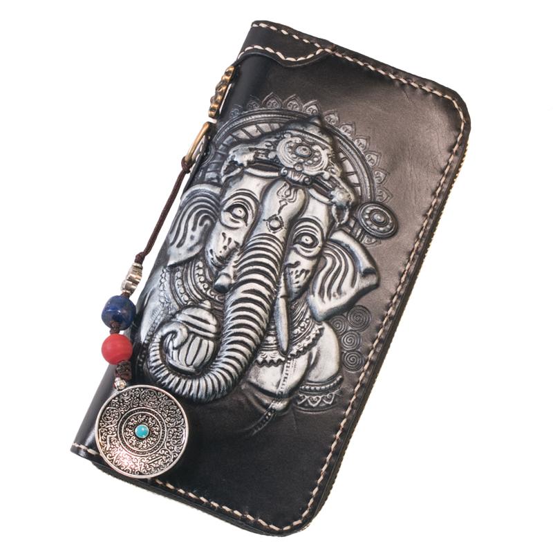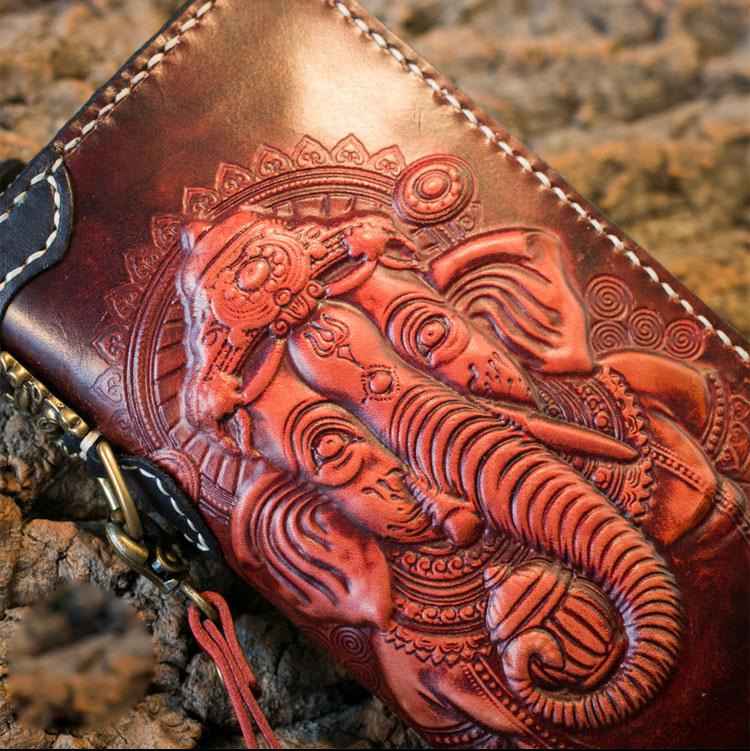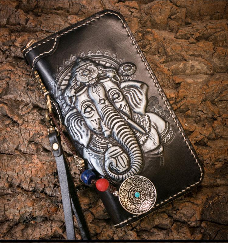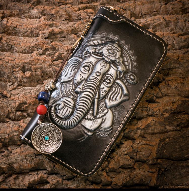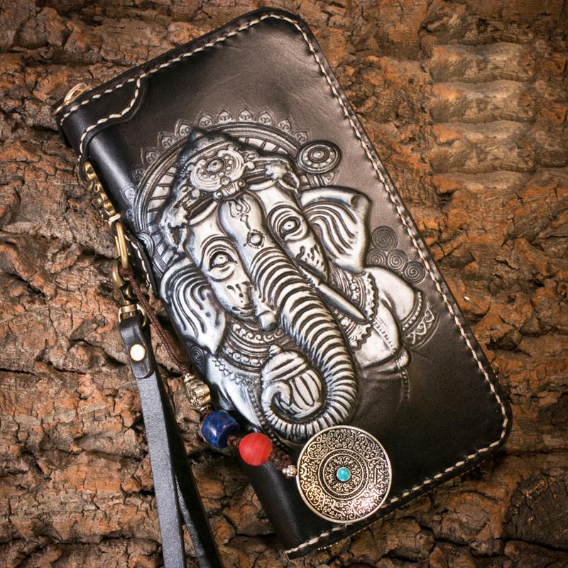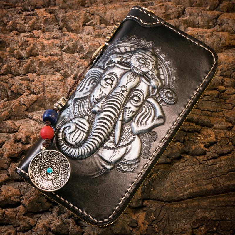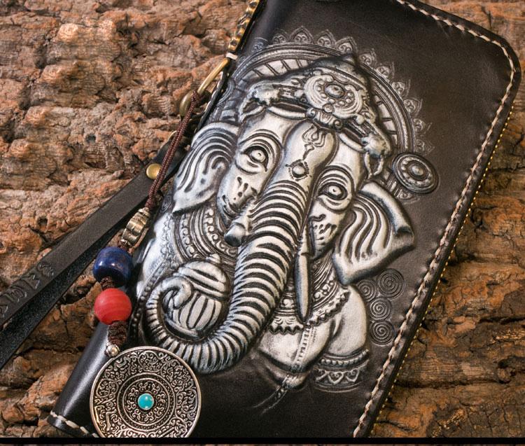Design: Handmade Leather Mens Chain Biker Wallet Cool Tooled Ganesha Wallet Long Zipper Phone Wallets for Men