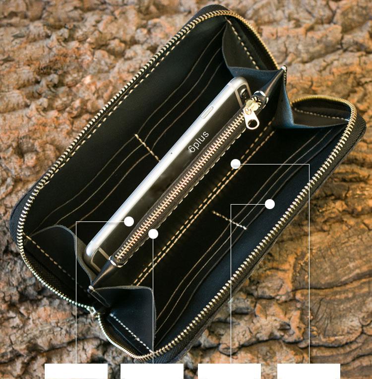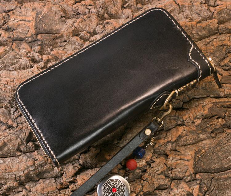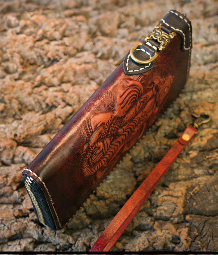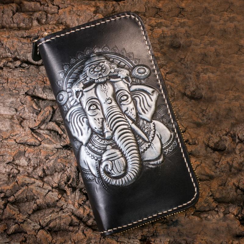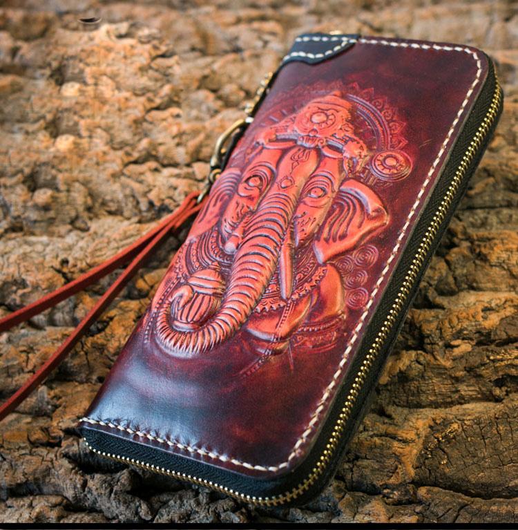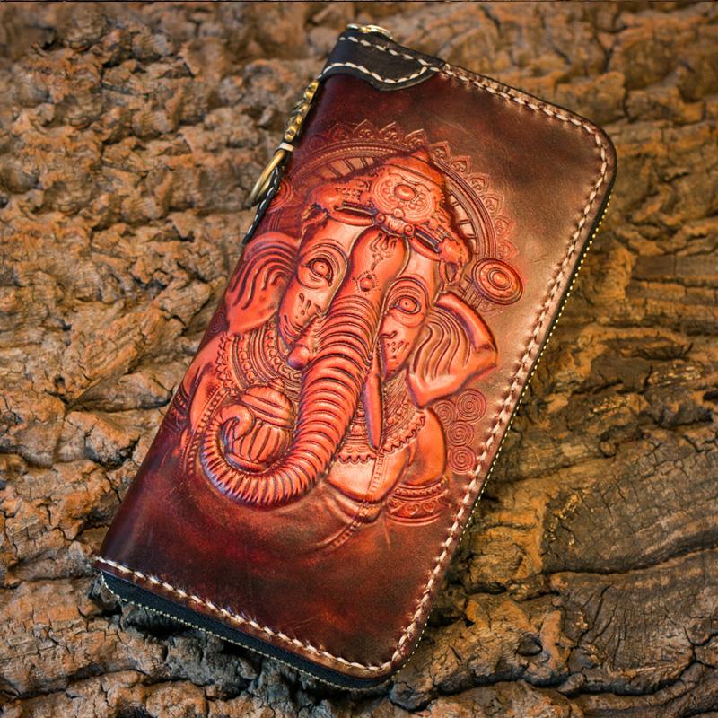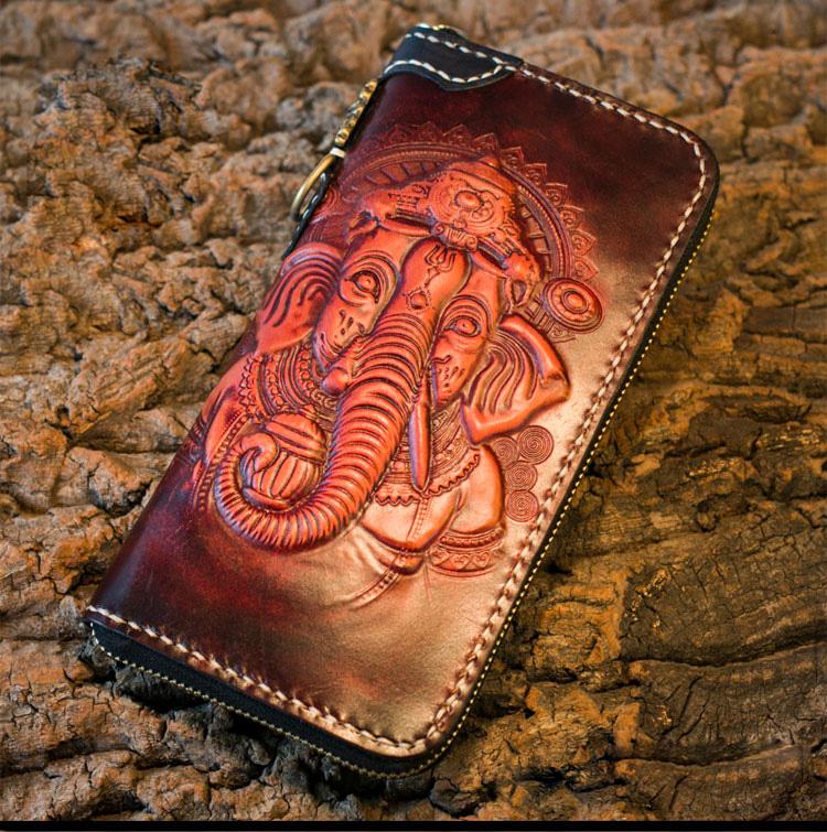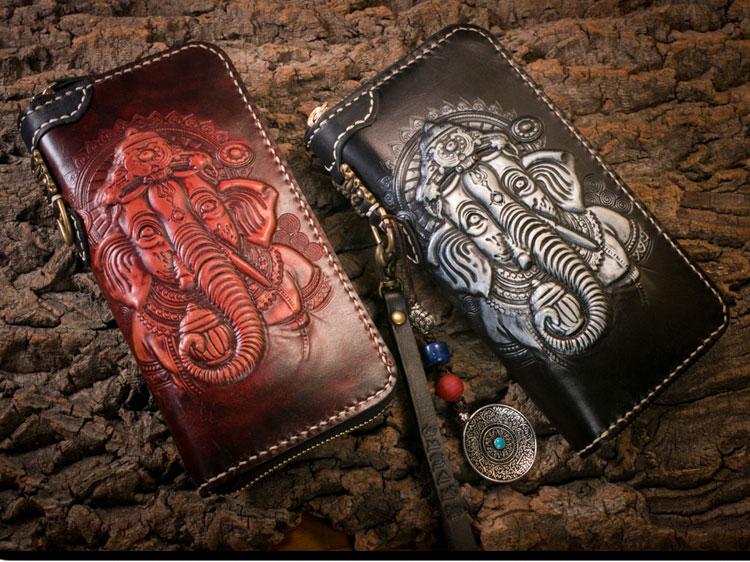 Design: Handmade Leather Mens Chain Biker Wallet Cool Tooled Ganesha Wallet Long Zipper Phone Wallets for Men