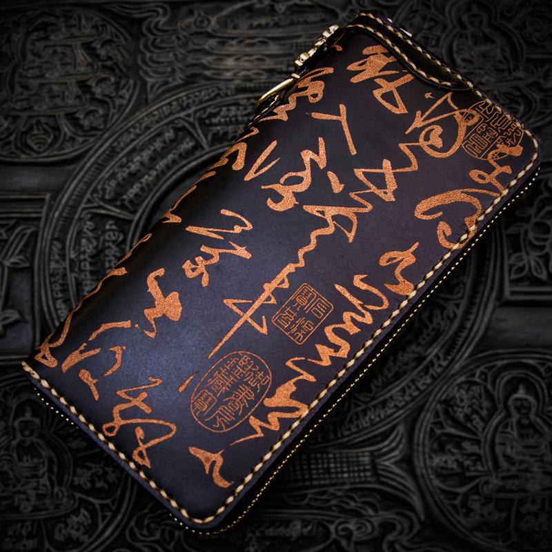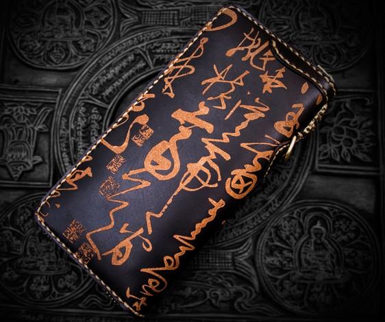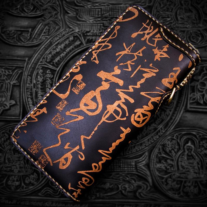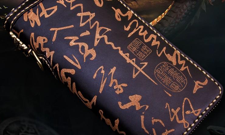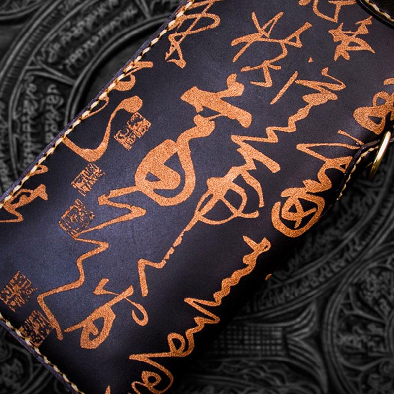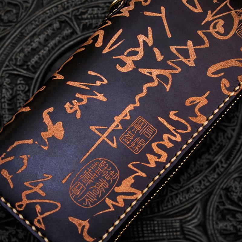 Design: Handmade Leather Mens Chain Chinese Handwriting Biker Wallet Cool Leather Wallet Long Phone Wallets for Men