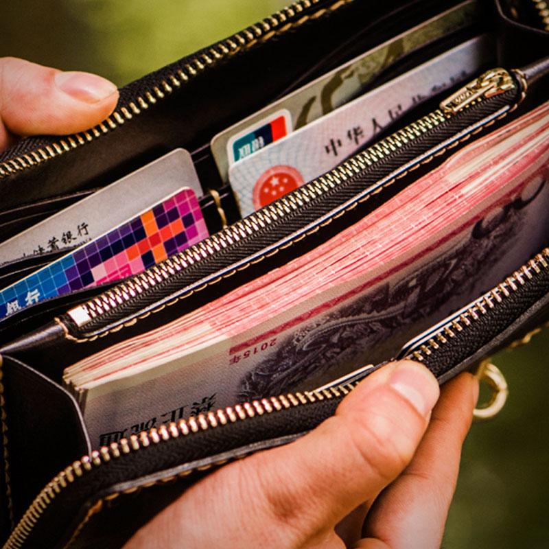 Style: Handmade Leather Mens Chain Chinese Handwriting Biker Wallet Cool Leather Wallet Long Phone Wallets for Men