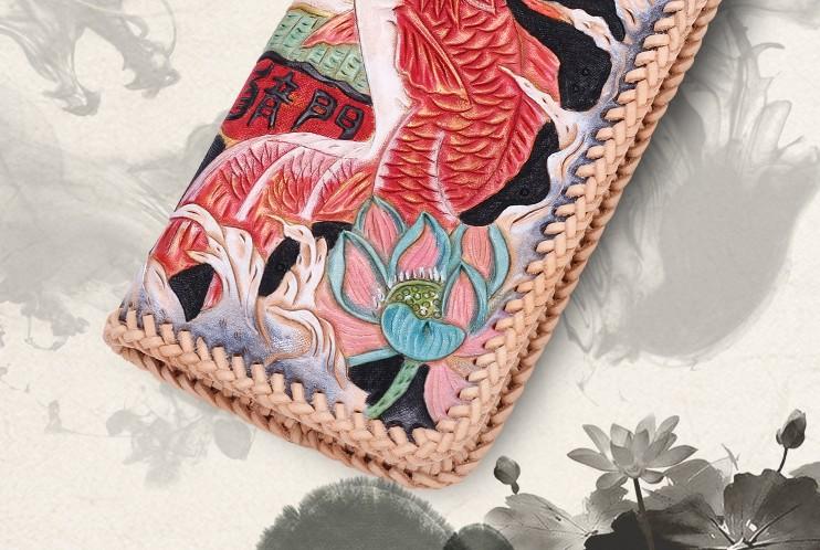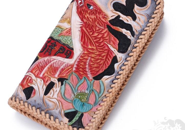 Design: Handmade Leather Mens Clutch Wallet Cool Carp Tooled Wallet Long Zipper Wallets for Men