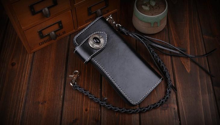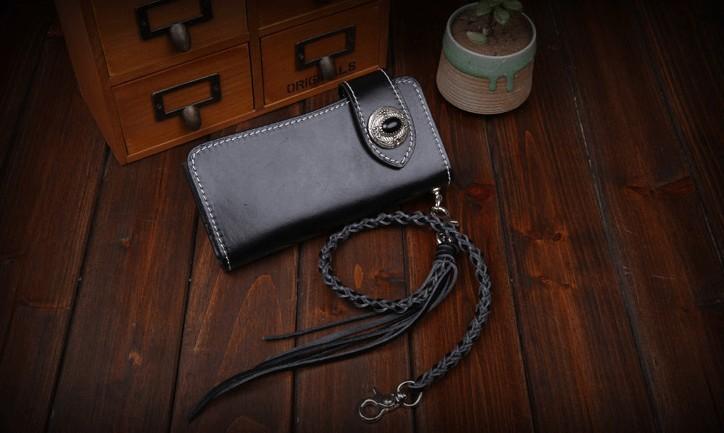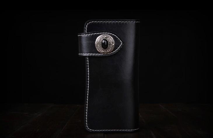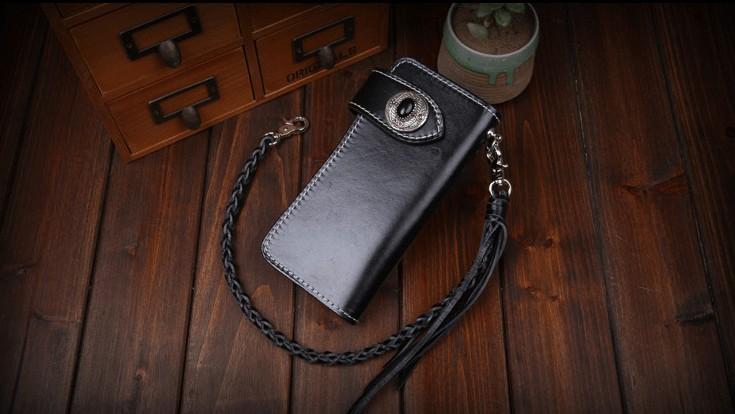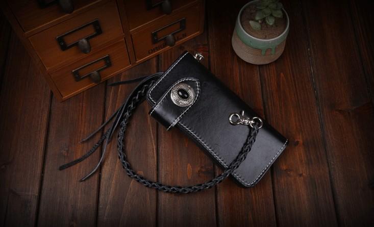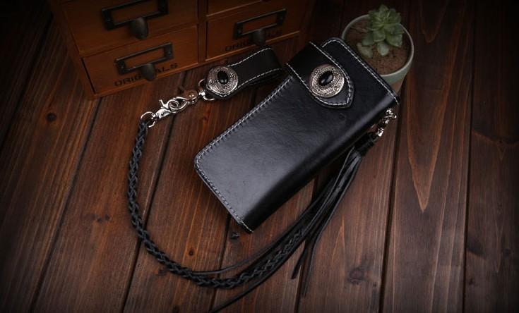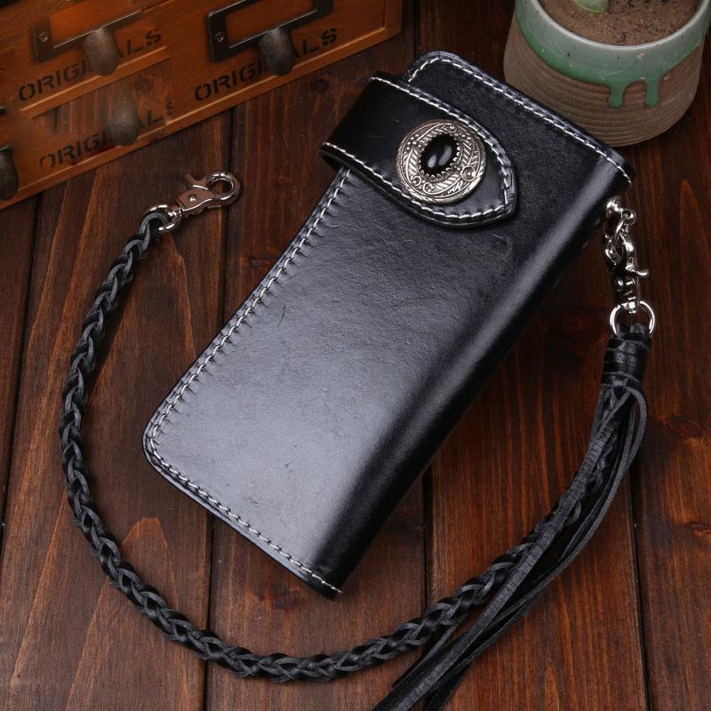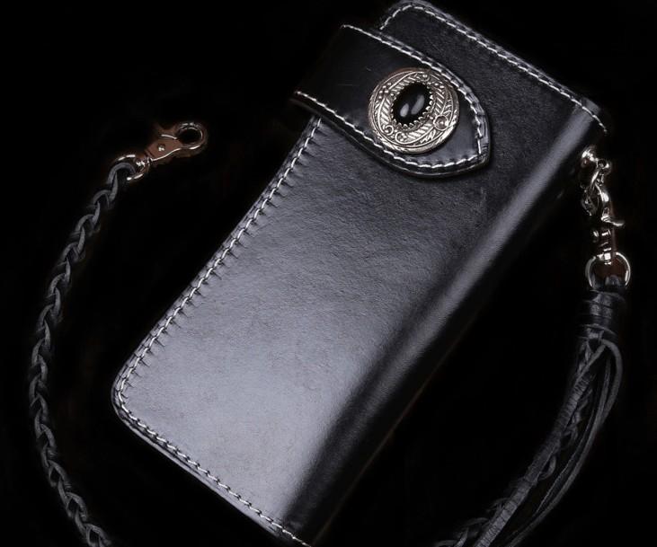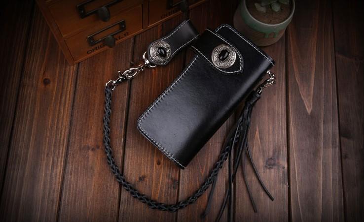 Handmade Leather Mens Cool Long Black Obsidian Chain Wallet Biker Trucker Wallet with Chain