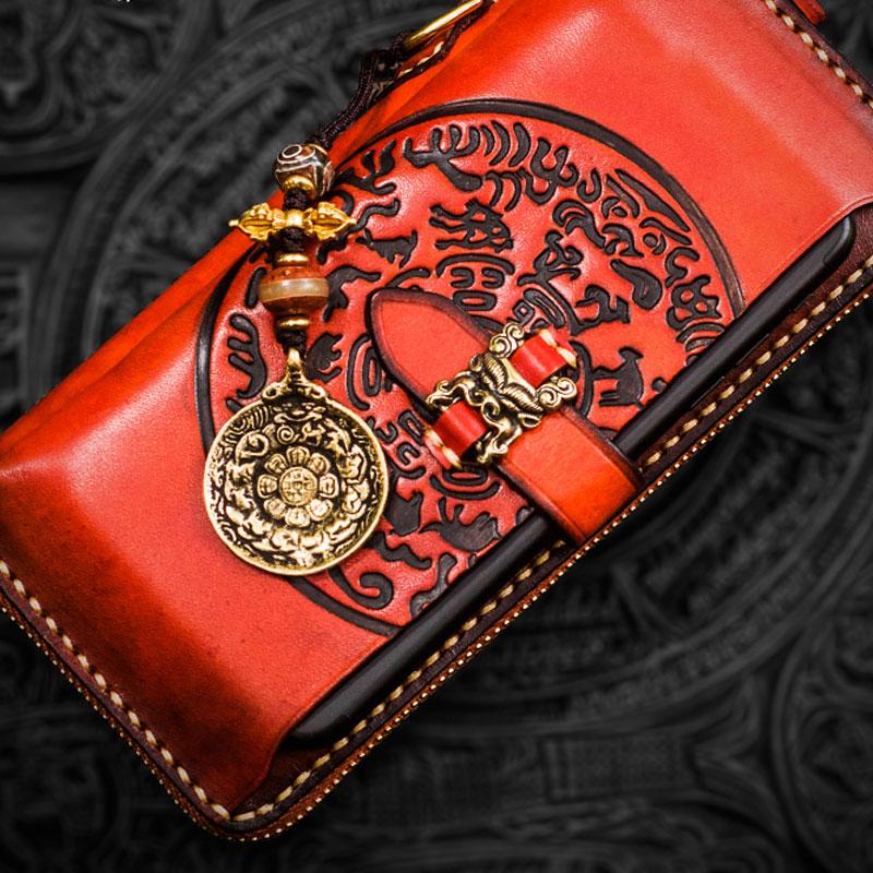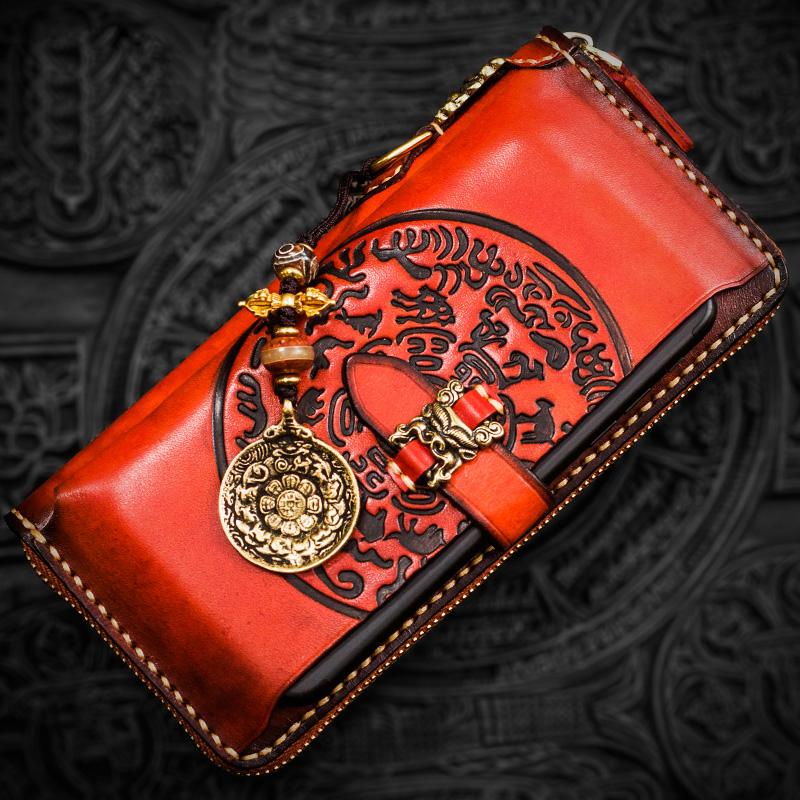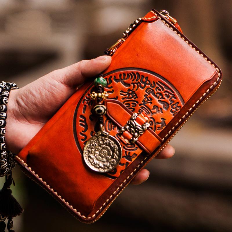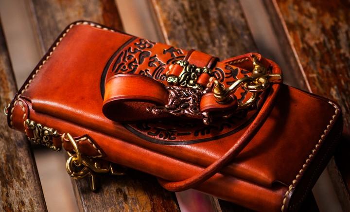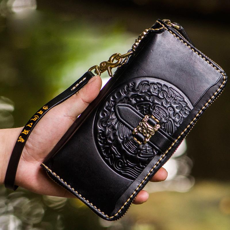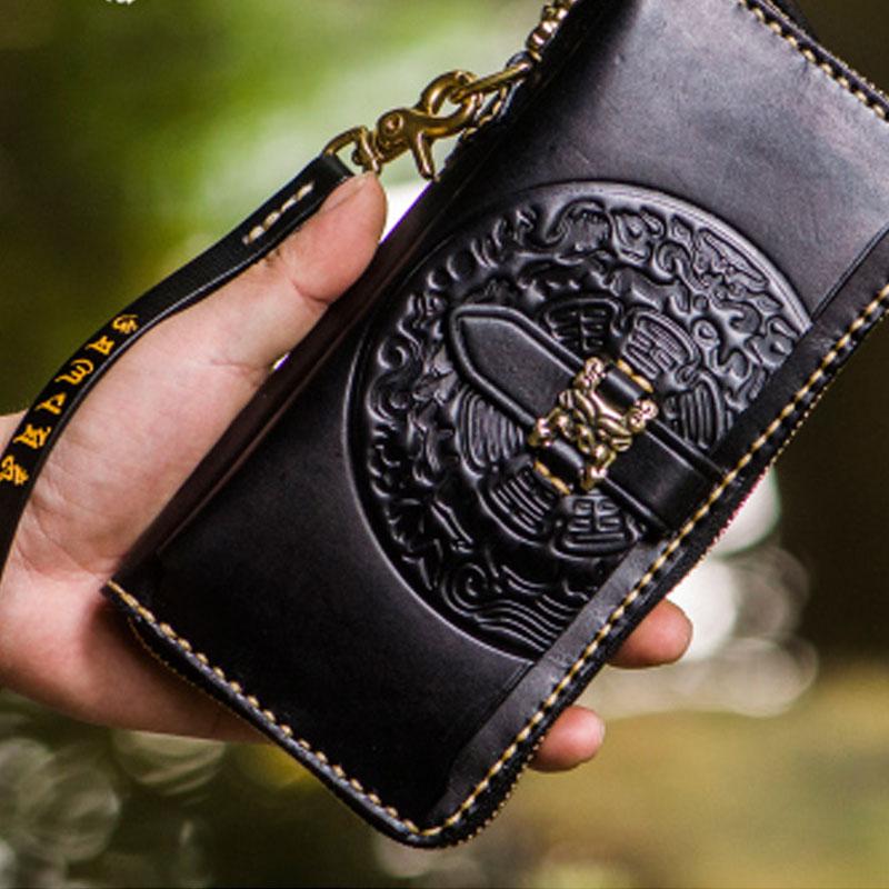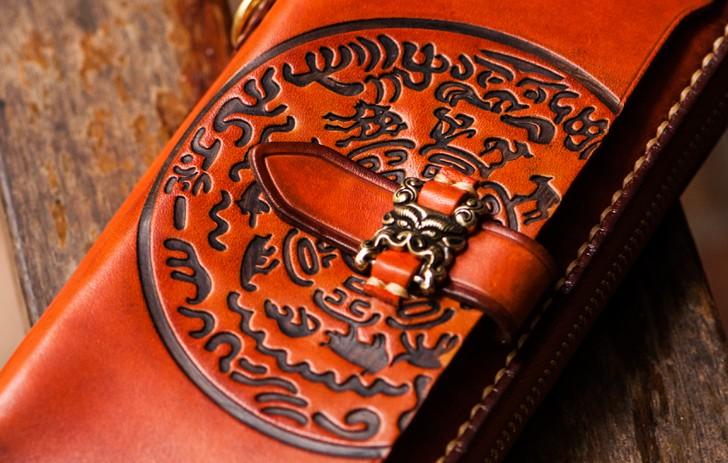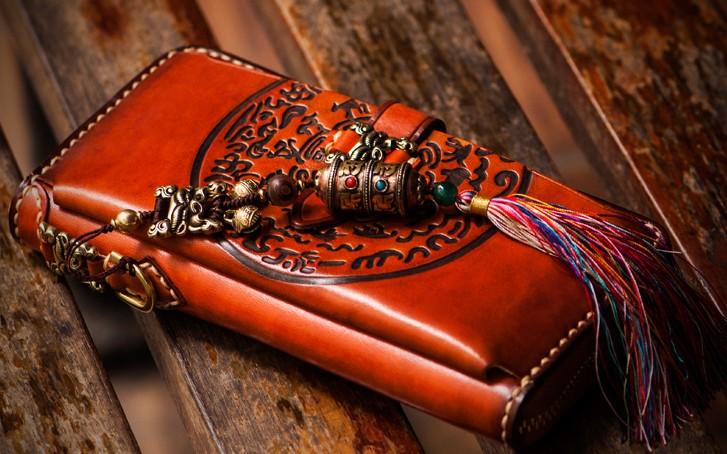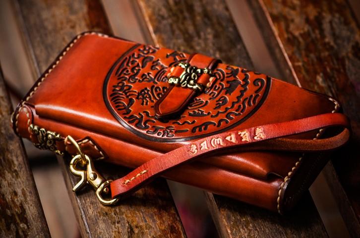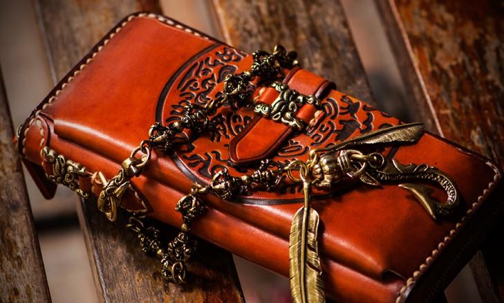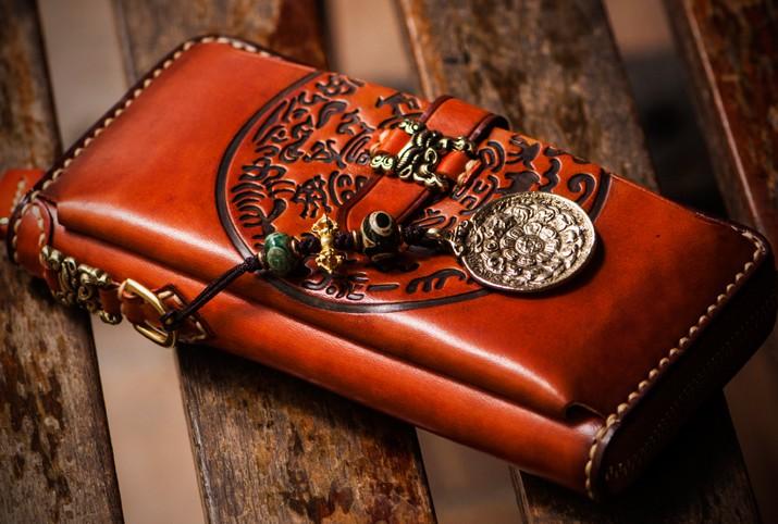 Design: Handmade Leather Mens Tibetan Chain Biker Wallet Cool Leather Wallet Long Clutch Wallets for Men