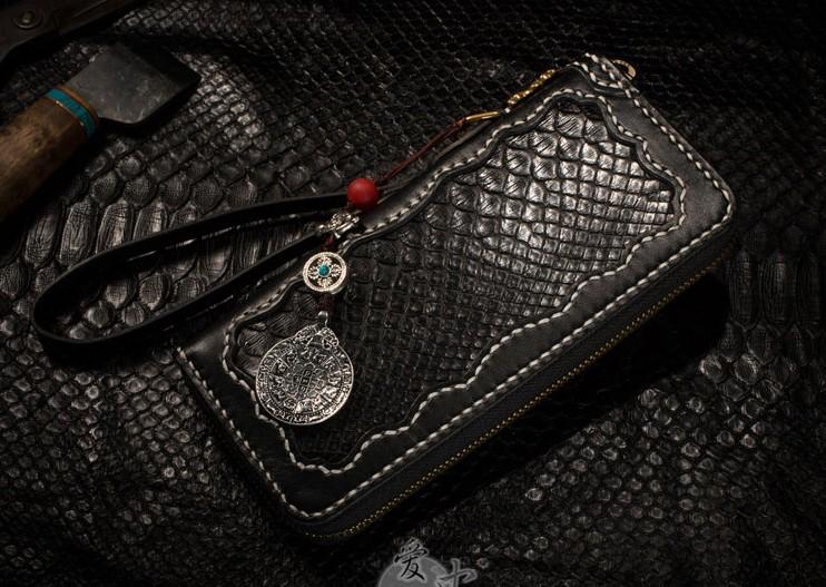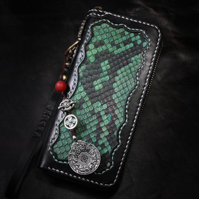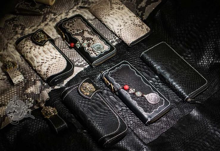 Design: Handmade Leather Python Skin Mens Chain Biker Wallet Cool Leather Wallet Long Phone Wallets for Men