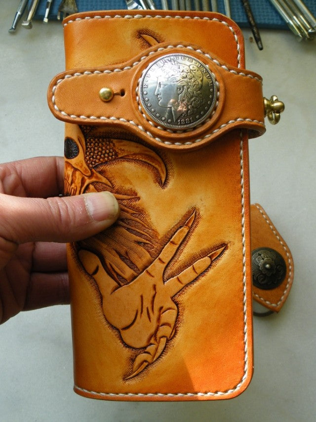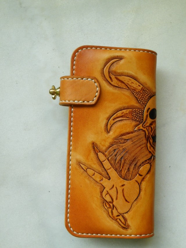 Style: Handmade Leather Skull Devil Mens Chain Wallet Biker Wallet Cool Leather Wallet Long Tooled Wallets for Men