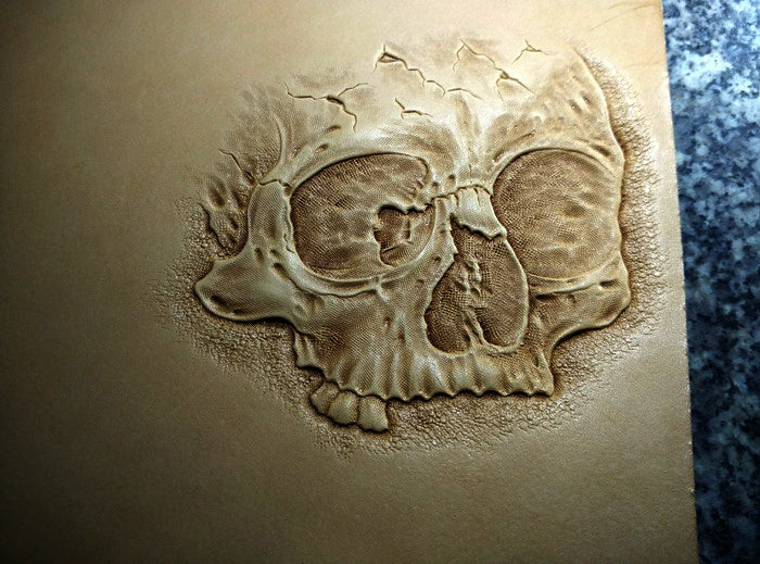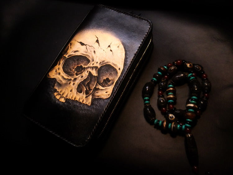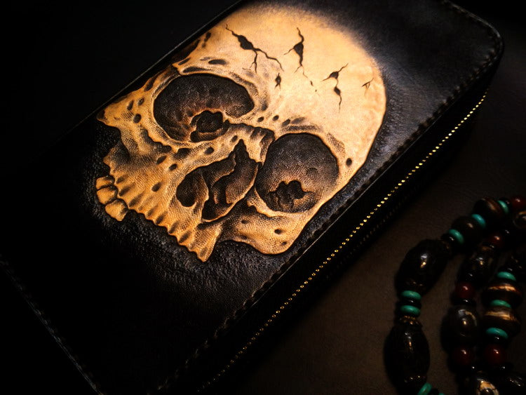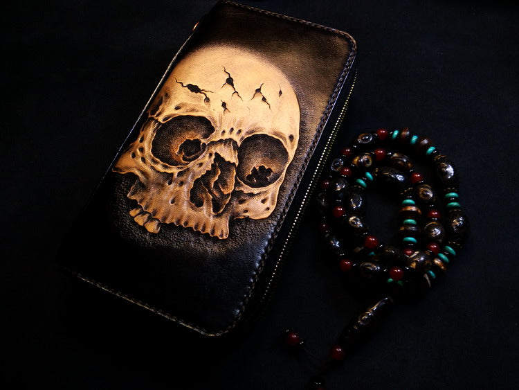 Design: Handmade Leather Skull Double Zipper Mens Long Wallet Biker Wallet Cool Leather Wallet Long Tooled Wallets for Men