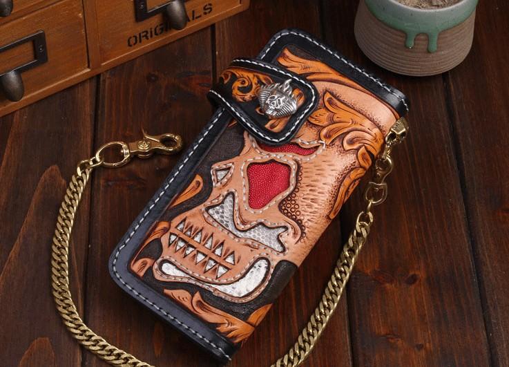 Design: Handmade Leather Skull Mens Chain Biker Wallet Cool Leather Wallet Long Tooled Wallets for Men